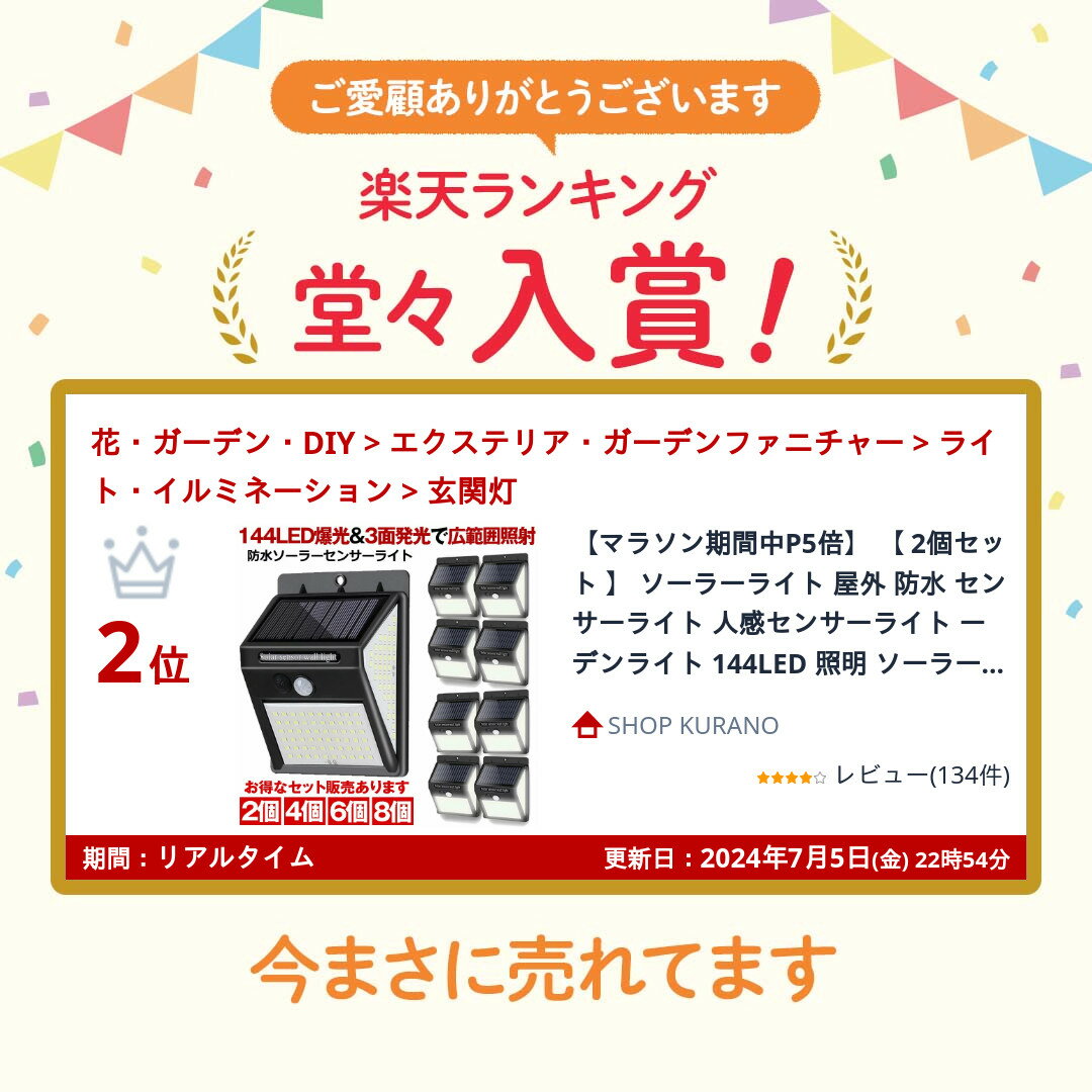■商品説明■ 高輝度&300度広角照明 最新144LED高輝度ソーラーライトは 2200mAhバッテリーを利用し 3面発光、照射範囲300度になります。 強パワーバッテリーを使って、照明効果を 大きくステップアップさせます 玄関、庭、駐車場、屋外照明 防犯などに使われてます。 ソーラー充電&ECOエネルギー 人感センサー&3種類照明モード 人感センサー機能を付け 人及び大型動物を通る場合、20秒自動点灯します。 反応角度140度 反応距離3〜5メートルまでです。 3種類の照明モード 常時点灯モード、点灯変更モード、自動反応点灯モードです。 IP65防水防塵&取り付け簡単 アウトドアで長期使用可、取り付け簡単 送料無料※北海道は+330円UP、離島地域及び沖縄県は+950円UPにて承ります。