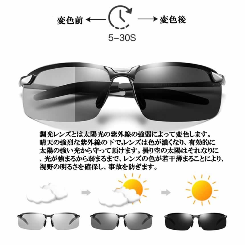 【自動でまぶしさカット】 偏光サングラス 変色 調光レンズ 偏光 調光 スポーツサングラス 9層 昼夜兼用 メンズ レディース UV400 紫外線カット スポーツ アルミフレーム 軽量 車 運転 釣り ドライブ アウトドア キャンプ 送料無料 SUNGRAS