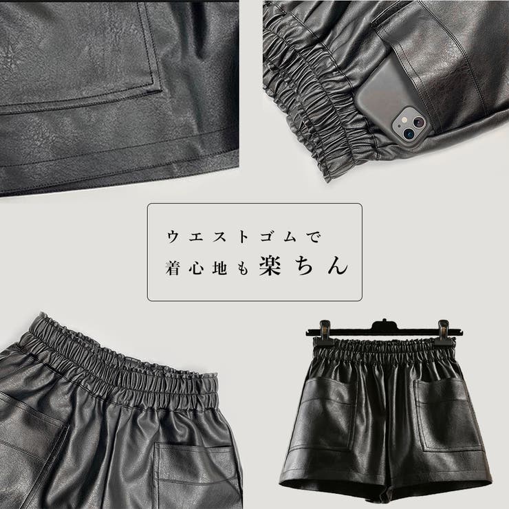 アクセサリーショップPIENA ショートパンツ レディース 春秋冬 短パン ウエストゴム ポケット付き 合皮 フェイクレザー おしゃれ 黒 パンツ・ズボン