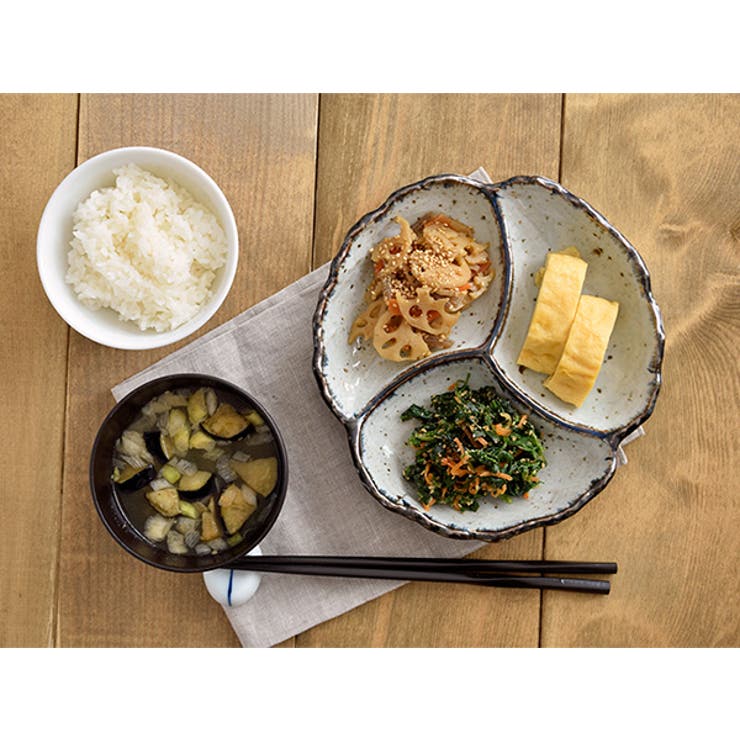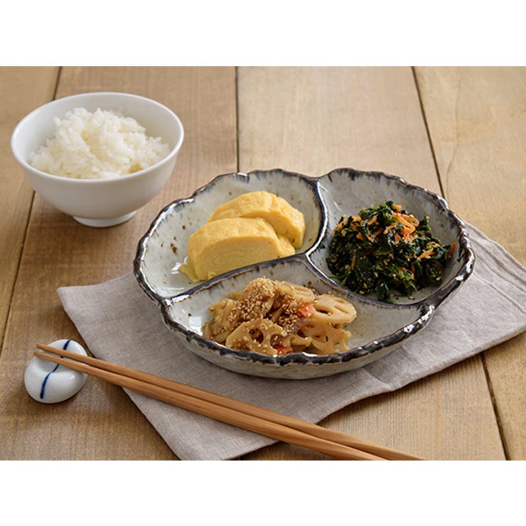 商品説明おかずを盛り付けるだけで様になる、花型の3つ仕切り皿。全体的に鉄粉と貫入が入ったおしゃれな和食器です。うつわの縁にかけられた釉薬のカラーが全体を引き締め、大人な雰囲気の和食器に仕上がっています。商品詳細サイズ/20.5×19.7×高さ3.7cm重さ/約540g(商品により誤差があります)質感/つややか素材/陶器生産地/日本(美濃焼)電子レンジ、食器洗い機使用不可オーブン(直火)不可※サイズは全て外寸になります。ご注意※ヒビを装飾に用いた「貫入」という技法の商品です。ご使用前には米のとぎ汁で煮て頂くか、水にしばらく浸して頂くと、油などが染み込みにくくなります。 ※裏側仕切り窪み部分に切れ目が入りますが形状の仕様上やむを得ないものとなりますが、破損ではございませんので安心してお使いください。※鉄粉の入り方、縁の青色の入り具合は個体差がございます。※お客様のお使いのモニター設定、お部屋の照明等により実際の商品と色味が異なって見える場合がございます。※画像に含まれる小物は使用イメージのために使用しています。返品・交換について購入後の交換は受け付けておりません。予めご了承ください。返品を希望される場合は購入履歴一覧の「ショップへの問い合わせ」よりお問い合わせください。=========================複数配送先指定について1件の注文に対して、異なる住所への配送は対応出来かねます。恐れ入りますが、異なる住所へ配送をご希望の場合、配送先毎に分けて注文いただきますようお願い申し上げます。【食器・キッチン用品WOMEN】