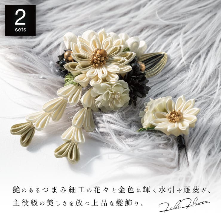 振袖や袴姿におすすめな髪飾り2点セット和装のヘアスタイルを彩る、花の髪飾り2点セットです。艶やかな生地のつまみ細工にピンポンマムなどの花々のコサージュ、金色に輝く水引やぶら飾りが華やかな雰囲気です。付け部分はコーム(櫛)式とUピン式です。成人式の振袖や、卒業式の袴によくお似合いです。また、洋装にもご利用いただけます。商品詳細■色ホワイト系×ブラック■取付コーム(櫛)式、Uピン式■sbn-kaz10534注意事項※表記サイズは実際の採寸値です。製品の性質上、個体差やパーツの向き等によって実際のサイズに誤差が生じる場合がございます。あらかじめご了承ください。※サイズ表記は付属のUピンを除いた長さです。サイズ表?縦横厚みぶら飾り大約11cm約12cm約4.5cm約9cm小約5cm約6cm約4cm返品・交換について購入後の交換は受け付けておりません。予めご了承ください。返品を希望される場合は購入履歴一覧の「ショップへの問い合わせ」よりお問い合わせください。=========================複数配送先指定について1件の注文に対して、異なる住所への配送は対応出来かねます。恐れ入りますが、異なる住所へ配送をご希望の場合、配送先毎に分けて注文いただきますようお願い申し上げます。【浴衣・着物WOMEN】