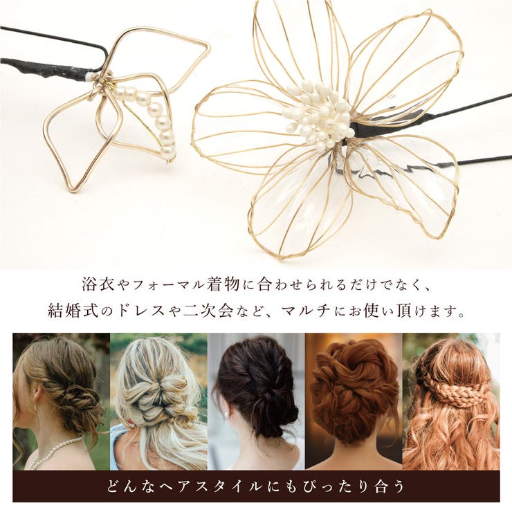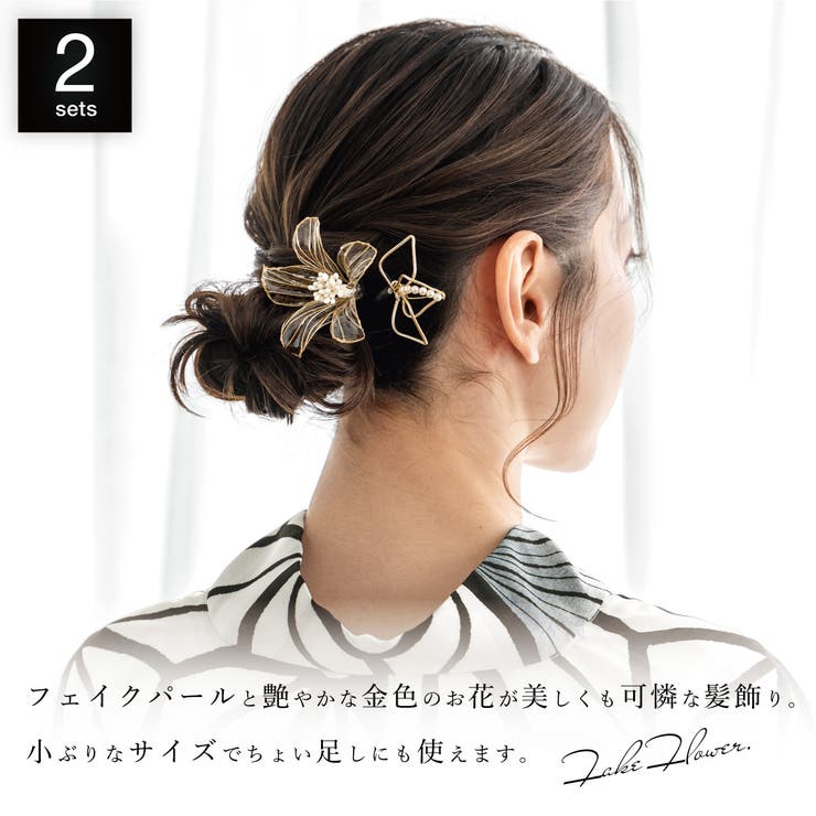 浴衣やカジュアルにおすすめ。艶やかな質感の髪飾り浴衣姿におすすめな花の髪飾りです。フェイクパールが施された金の花にディップ液を使った艶やかな質感が美しい花をイメージしたモダンなデザインです。2点セットですので、着物に合わせ自由な組み合わせでご使用いただけます。小ぶりの髪飾りなので、ちょい足しにもぴったりです。髪飾りの留め具はUピン式です。洋装のパーティや結婚式にもオススメします。商品詳細■色クリア×ゴールド■取付Uピン式■sbn-kaz10681注意事項※表記サイズは実際の採寸値です。製品の性質上、個体差やパーツの向き等によって実際のサイズに誤差が生じる場合がございます。あらかじめご了承ください。※表記サイズは付属のUピンを除いた長さです。※ディップ液を使用しているため、強い力を加えると破損の恐れがあります。お取り扱いにご注意ください(保存の際は直射日光や高温多湿を避けてください)。サイズ表?縦横高さ大約7cm約7cm約4cm小約3.5cm約5.5cm約1.5cm返品・交換について購入後の交換は受け付けておりません。予めご了承ください。返品を希望される場合は購入履歴一覧の「ショップへの問い合わせ」よりお問い合わせください。=========================複数配送先指定について1件の注文に対して、異なる住所への配送は対応出来かねます。恐れ入りますが、異なる住所へ配送をご希望の場合、配送先毎に分けて注文いただきますようお願い申し上げます。【浴衣・着物WOMEN】