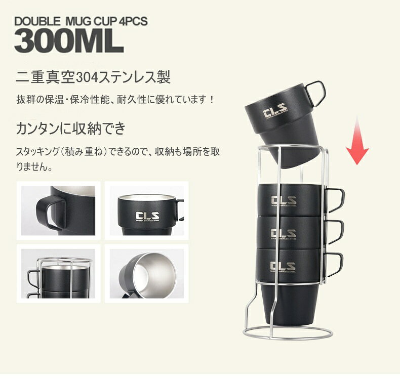 楽天スーパーSALE 半額 数量限定キャンプコップ 4個セット 300ml ステンレス コップ 屋外 食器 収納 持ち運び 軽い 軽量 コンパクトキャンプ アウトドア バーベキュー BBQ 積み重ね プレゼント 黒 ブラック おしゃれ