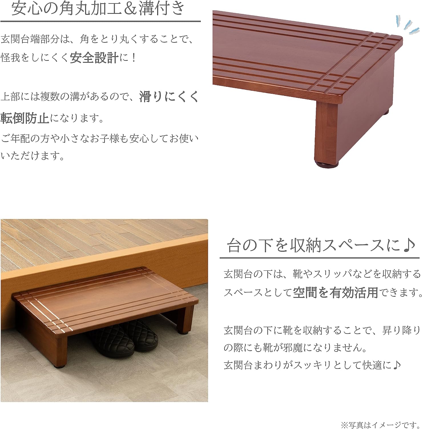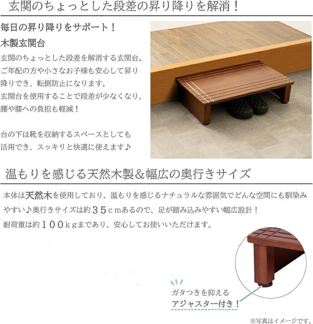 Pickup Item!踏み台 玄関 木製 手すり 付き 玄関台 幅66,880円踏み台 玄関 木製 手すり 付き 置くだけ 玄8,780円玄関台 手すり付き 幅 70cm 100cm 8,780円~踏み台 手すり 手すり付き 玄関 アルミ ステ6,480円踏み台 両側 手すり 玄関 2段 アルミ 幅712,980円踏み台 手すり 玄関 アルミ ステップ台 2段9,980円踏み台 折りたたみ 軽量 折り畳み 高さ10c2,380円【 左右 両側 手すり 】 踏み台 2段 アル10,680円 木製玄関台 60cm/90cm ■毎日の昇り降りをサポート! 玄関のちょっとした段差を解消します。 ご年配の方やお子様の転倒防止に。 腰や膝の負担も軽減にも。 ■温もりを感じる天然木製&幅広奥行 本体は天然木を使用し、温もりを感じるナチュラルな雰囲気 奥行はたっぷり35cm!踏み込みしやすい幅広設計。 耐荷重は約100kgまであるので安心してご使用いただけます。 ■角丸加工&溝付き 本体端部分の角を取り、滑らかな加工をすることで怪我をしにくい安全設計。 上部には複数の溝があり、滑りにくく転倒防止に。 ■収納スペース有り 玄関台の下は、靴やスリッパを収納できるので 空間を有効活用できます。 収納すれば、昇り降りの際にも靴が邪魔することなく スッキリとした玄関に。 【商品詳細】 <幅60cm> 本体サイズ:(約)幅60×奥行35×高さ14.5cm 本体重量:(約)4.05kg 耐荷重:(約)100kg カラー:ウォールナット 材質:本体/天然木(ラバーウッド)、アジャスター/ポリエチレン、表面加工/アルキド樹脂塗装 品番:TH3-G60WAL JAN:4545244644642 <幅90cm> 本体サイズ:(約)幅90×奥行35×高さ14.5cm 本体重量:(約)5.95kg 耐荷重:(約)100kg カラー:ウォールナット 材質:本体/天然木(ラバーウッド)、アジャスター/ポリエチレン、表面加工/アルキド樹脂塗装 品番:TH3-G90WAL JAN:4545244644659 <幅60cm>をご注文時の送料 北海道・沖縄県へのお届けは別途送料が発生する場合がございます。 こちらの商品のお送り先が北海道・沖縄県の場合の、追加送料につきましてはこちらをご確認ください。 <幅90cm>をご注文時の送料 北海道・沖縄県へのお届けは別途送料が発生する場合がございます。 こちらの商品のお送り先が北海道・沖縄県の場合の、追加送料につきましてはこちらをご確認ください。