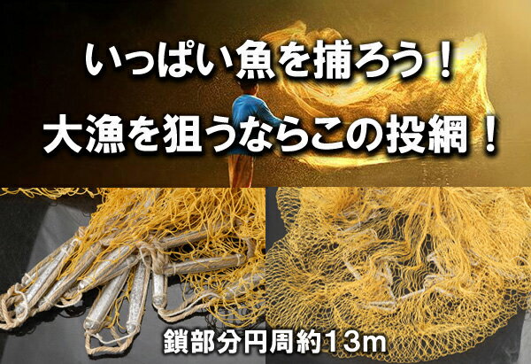 その他 釣り関連商品 はこちらテント、アウトドアテーブル、バーベキュー用品、クーラーボックス、ランタン、ライフジャケット、自転車、キックボードなど その他 スポーツ・アウトドア関連商品 はこちら 10P03Dec16Pickup Item!【 40〜60メッシュ 】防虫ネット 害虫ネッ1,640円~ネット 網 階段ネット メッシュ 1m × 1,880円ポテトフライヤー フライヤー 業務用 フライバ3,280円~パラソル万力 パラソル 固定 角度調節可能 パ1,380円洗濯ネット 布団用 大型 特大 ランドリーネッ890円【 収納ケース付き 】 バドミントン ネット 4,180円クライミングネット 登山ネット クライミング 2,480円カヤック キャリーカート カヤックカート アル5,480円 投網 投げ網 岸辺や船上から魚がいると思われる地点に投げ入れて時を待つ! さあ「投網をうって」大漁を狙え!! 川や海岸、磯などで大漁を狙う事が出来る、漁具の投網です。 細くなった部分を、利き手の逆の肩に軽く巻きつけ、 鎖の付いた方を広がるように勢いよく投げると網が広がり、大量の魚をゲット! ※川や海・湖・池の生態系に影響を及ぼすので無許可でのご使用はおやめ下さい。 【商品詳細】 鎖部分 円周約13m 網目:縦横約2cm 800目 重さ:約3.5kg ▼必ずご確認ください▼ウォーターセーフティガイド