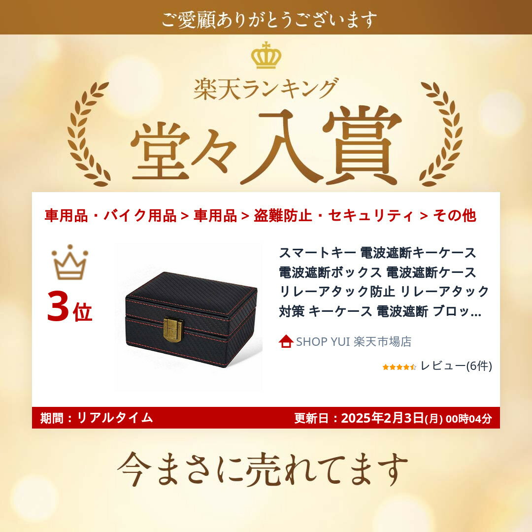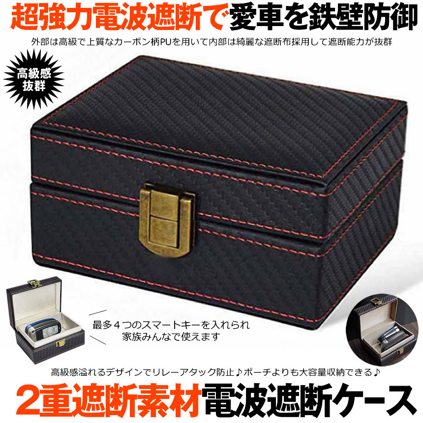 電波遮断ケース電波遮断であなたの愛車をしつかり守る。2重遮断素材を使って電波遮断率はアップ外部は高級で上質なカーボン柄PUを用いて普通の電波遮断ポーチよりもっと使用に耐えます。ケースの内部は綺麗な遮断布採用して優れる遮断能力があります。耐摩擦・高品質なPUレザーと、銅メッキしたロック、上品な外観デサントです。プレゼントとしても、自宅に置かれて使ても優れます。商品サイズ:11.5×9×6.3cm 重量207g送料無料※北海道は+330円UP、離島地域及び沖縄県は+2000円UPにて承ります。