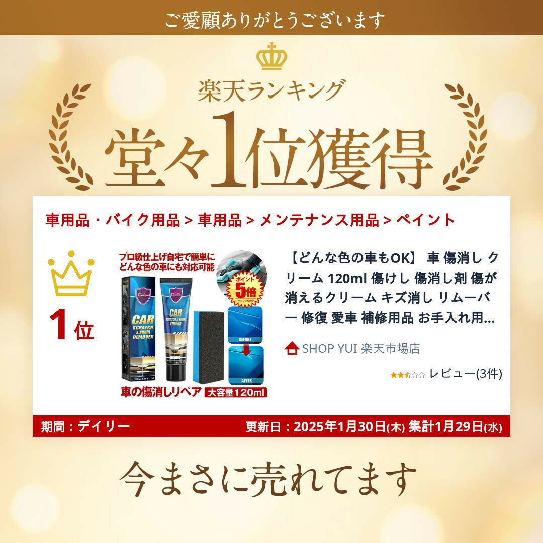 驚きのキズ消しリムーバーで愛車を新車のように輝かせましょう!あなたの愛車にいつの間にかできた小さな傷や爪痕、気になりますよね。そんなときに頼りになるのが、プロも太鼓判を押す驚きのキズ消しリムーバーです。この商品は、簡単な操作で気になる小キズを集中補修し、愛車を美しい状態に保つことができます。特徴とメリット簡単ステップで美しい仕上がり塗って拭くだけのシンプルな作業で、プロフェッショナルな仕上がりを実現。難しい手順は一切不要で、誰でも簡単に使えます。どんな色の車にも対応このリムーバーは、車の色を選びません。どんなカラーの車でも、違和感なく自然に小キズを消去します。多用途に対応ドアノブの爪の引っかき傷や、小さな引っかき傷、塗装の渦巻き傷など、さまざまな種類のキズに対応。あらゆる場所の傷をスッキリ隠せます。プロも認める品質自宅で簡単にプロ級の仕上がりを手に入れることができます。使い方傷のある部分を洗浄まず、傷のある部分をきれいに洗い、汚れやホコリを取り除きます。リムーバーを塗布キズ消しリムーバーを適量取り、傷の部分に塗り込みます。薄く均一に塗るのがポイントです。拭き取り乾いた柔らかい布でリムーバーを拭き取ります。数回繰り返すことで、より効果が実感できます。最後に愛車の美しさを保つための必須アイテム、「驚きのキズ消しリムーバー」。簡単な操作で、どんな小さな傷もスッキリ消去し、新車のような輝きを取り戻すことができます。あなたの愛車をいつでも美しく保ちたいなら、ぜひこのリムーバーをお試しください。今すぐ手に入れて、愛車の輝きを再現しましょう!■送料無料■メール便 全国送料無料