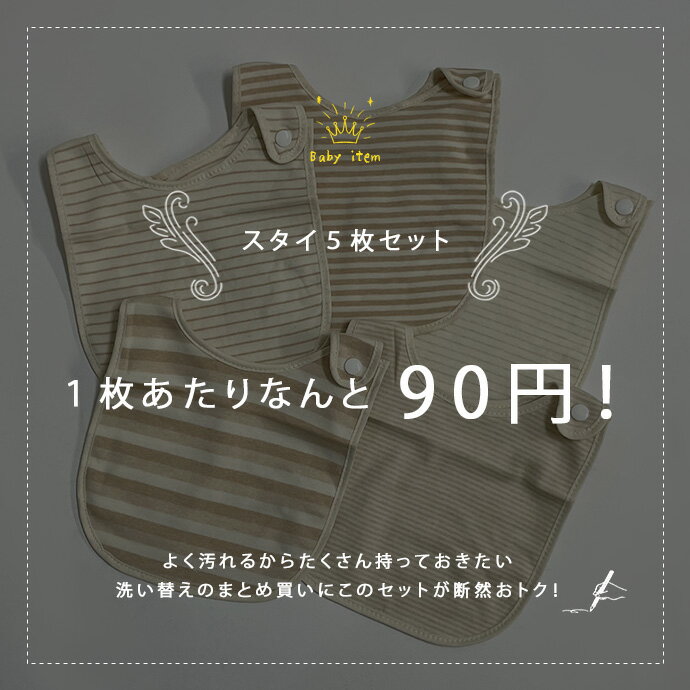 《ご注文についてのお知らせ》 当店では複数店舗で在庫を共有しており、システムにて在庫の調整を行っております。 タイミングにより在庫にズレが発生し、在庫数更新が間に合わない場合がございます。 ご注文頂きました順番によっては品切れ(欠品)となる場合がございます。 その際には、別途ご連絡させて頂きます。 お客様へはご迷惑をお掛け致しますが、ご理解賜りますようお願い致します。商品詳細 商品名 スタイ5枚セット 商品説明 よく汚れるからたくさん持っておきたい!スタイ5枚セット ヨダレや吐き戻しなど、赤ちゃんは一日に何度もお口を拭くので洗い替えのまとめ買いにぴったりのセット。 一枚あたりなんと 90円! 素材は赤ちゃんの肌に優しいオーガニックコットンを使用。 ※パッケージ裏面 の記載について※ パッケージ裏面に「〜コットン素材を使用してこの靴下は作られています。」と 記載がございますが、こちらはメーカーの生産時による記載間違いでございます。 ※商品自体はスタイでお間違いございません。 ご理解、ご了承くださいますようお願い致します。 洗濯時のご注意 ・漂白剤は使用しないでください。 ・乾燥機を使用せずに陰干ししてください。 ・洗濯機を使用する場合は洗濯ネットに入れてください。 ・淡色物には蛍光剤の入っていない洗剤を使用してください。 ・濃色物は淡色物と一緒に洗わないでください。 素材 綿:100% 生地感 オーガニックコットン 透け感なし サイズ フリーサイズ お届け方法 追跡可能メール便(ゆうパケット) ※ご注文商品の点数によって宅配便に切り替えてまとめて発送させていただく場合がございます。 ※メール便注意事項をご覧の上、ご注文ください。 ≫メール便注意事項はこちら≪ 注意点 ◎商品写真はできる限り実物の色に近づけるよう努力しておりますが、お客様がご使用になられるパソコンのモニターやカラー設定・お部屋の照明・日光などにより色の変化が感じられる場合がございます。予めご理解いただきますようお願い致します。 ◎生産工程上、カラーNO.が同じでも若干のカラーの違いや濃淡がみられる場合がございます。ご了承の上お買い求めいただきますようお願い致します。 ◎実際の色名に近づける為、タグに表示されているカラー名と異なる場合がございます。 ◎漂白剤は使用しないでください。 ◎再販時は出来るだけ同じものを生産するようにメーカーに依頼しておりますが、生産時期により若干ではございますが、カラーや仕様が異なる場合がございます。ご了承の上お買い求めいただきますようお願いいたします。 ◎中身の商品は新品・美品ではございますが、包装袋に少々ダメージがある場合がございます。恐れ入りますがご了承くださいませ。 ▼ ハンカチセットもあります!▼