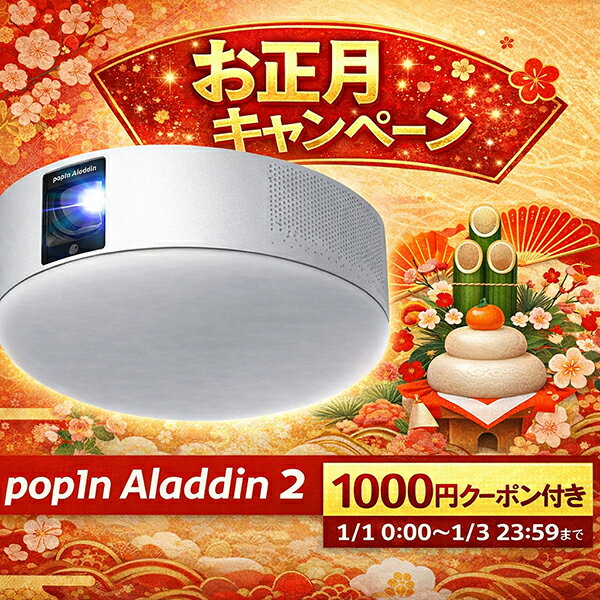 通常使用で故障した場合、購入日より一年間は補償対象です。※北海道・沖縄・離島配送OK! 未来の壁を実現、楽しめるアプリが多数搭載 いつでも手軽に映画やドラマが楽しめるほか、部屋の雰囲気を変えるインテリアコンテンツ、 親子のコミュニケーションに役立つコンテンツ、暮らしを快適にするコンテンツなど、 popIn Aladdinならではのコンテンツと生活空間体験がどんどん進化していきます。 【動画コンテンツ】 YouTube 、 Netflix 、 Hulu 、 AbemaTV 、 U-NEXT 、 DAZN 、 Paravi など 【インテリアコンテンツ】 壁時計・美風景・ヒーリングライト・フォトメモリーズ・きせかえ時計・Moon Lightなど 【キッズコンテンツ】 学習ポスター・なんでなの?・世界の絵本・等身大動物図鑑・うごく太陽系・YouTube Kidsなど popIn Aladdinが選ばれる理由 1. 場所を取らない大画面 天井の一般的な照明器具、シーリングライト。 私たちは、このシーリングライトに「高性能プロジェクター」と「高音質スピーカー」を搭載し、 コードレスで置き場所を取らない画期的な3in1シーリングライトを開発しました。 そして、魔法のような暮らしの体験を目指し、popIn Aladdin(ポップイン アラジン)と名付けました。 2. 工事なしで簡単取り付け 設置には家庭用の引掛シーリングがあれば、追加工事は不要で、誰でも簡単に取り付けることができます。 電源は引掛シーリングのコンセントから供給され、別途電源ケーブルを必要としません。 天井に設置することで、寝室のレイアウトを変える必要はありませんし、置き場所やコードの配置も気にする必要はありません。 3. 未来の壁を実現するコンテンツ いつでも手軽に映画やドラマが楽しめるほか、部屋の雰囲気を変えるインテリアコンテンツ、 親子のコミュニケーションに役立つコンテンツ、暮らしを快適にするコンテンツなど、 popIn Aladdinならではのコンテンツと生活空間体験がどんどん進化していきます。 8つの特徴 ・買ったその日に大画面 スクリーン不要で高画質のフルHD映像を大画面で投影できます。天井に引掛シーリングがあれば、誰でもあっという間に取り付け可能で、買ったその日に大画面を堪能できます。 ・短い設置距離でも大画面 短焦点レンズを搭載することで、設置距離が壁から短くても、鮮明な大迫力の大画面を実現します。4畳のお部屋*でも60インチの大画面が実現できます。また、投影面を見やすい位置へと、上下左右、気軽に調整することができ、すべての間取りにあった映像空間をお楽しみいただけます。*設置距離は1.2mとなります。 ・全ての間取りにフィット 「部屋が狭いから大画面は無理」を解決! popIn Aladdin 2 なら 4 畳のお部屋でも見や すい位置で 60 インチ、 6 畳のお部屋で夢の 100 インチが実現。あなたのお部屋は? ・YouTubeやNetflixはもちろん、地上波や、録画番組も見られるテレビ超えの大画面 人気の動画サービスが勢揃い。インテリアを邪魔しない、場所を取らない大画面、これはpopIn Aladdinが実現した新しいテレビ体験です。 ・調光・調色 1万通り 調光・調色は 1 万通り。ご自宅のインテリア にあった、 お好みの色 4 種類をカスタマイズ 設定できます。 寝室に使いやすい設計で、常 夜灯も一発で点灯可能。 ・高音質スピーカーであふれる臨場感 世界中の音楽ファンが愛するハーマンカードン製のスピーカーを採用しています。AirPlay対応で、お好きな音楽を気軽に楽しめ、まるでカフェのような空間を演出できます。8Wのステレオスピーカーで、天井から降り注ぐ、快適な音楽体験をご堪能ください。 ・生活のリズムを整える自動タイマー機能 Aladdin Timer(アラジンタイマー)をセットするだけで、朝には心地良い目覚めを演出。夜には快適な睡眠へと導き、一日の生活リズムを整えます。 ・スマホの画面をミラーリング投影 スマホのミラーリング機能も搭載。スマホで撮影した写真や動画などを投影できます。 ※Apple社製品と一部のAndroid端末に対応しています。 ※よくあるご質問(Q&A) ・リニューアル品とは何ですか? リニューアル品とは、家電量販店の在庫として一時保管されていたものを、メーカーにて一度回収し、動作確認を行った上で、外装箱等を新たに交換・再梱包した商品でございます。 そのため、商品自体は未使用ではございますが、一度開封された履歴があるお品物となります。何卒ご理解のほどお願い申し上げます。 ・Netflixは見られますか? はい、閲覧可能です。 Netflix の最新バージョンが Android 6 OSをサポートしなくなったことに伴い、Android 6 OSを搭載している「Z6 Polar Meets popIn Aladdin」および「popIn Aladdin(初代機)」の2機種では、2025年8月7日以降 Netflixをご利用いただけなくなりました。当商品(popIn Aladdin2)はAndroid 9 OS搭載ですので、閲覧に問題はございません。 ・リモコンは付属していますか? はい。付属品は全て一式揃っております。 ・保証はありますか? 通常使用で故障した場合、購入日より一年間は補償対象になります。使用上の誤りによる故障など