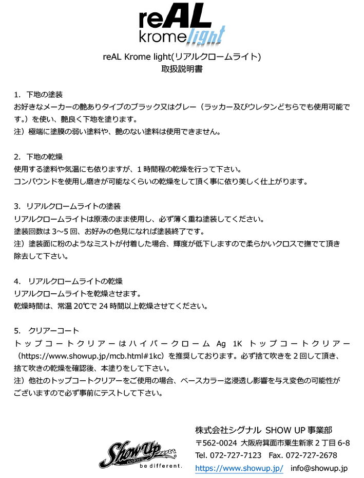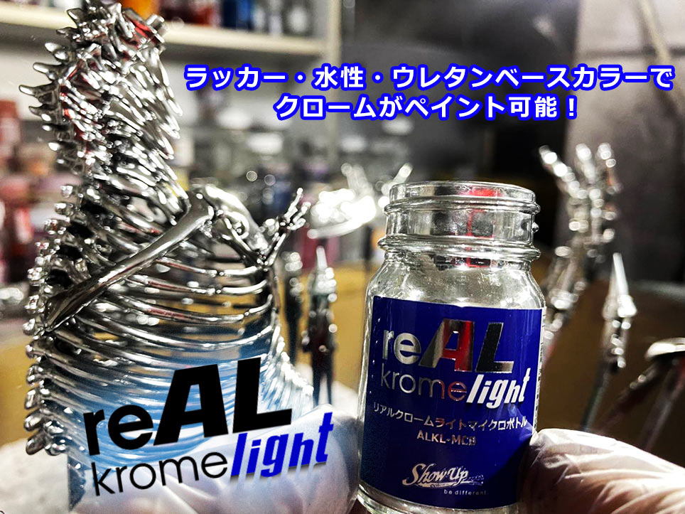 商品説明メーカー名SHOW UP 商品名reAL Krome light 内容量15ml.50gカラークロームメッキ 商品説明SHOW UP アルミクローム reAL Krome 第二弾!! reAL Krome light - リアルクロームライト!! 従来のリアルクロームではベースカラーに塗膜の強いウレタン塗料が必須でしたが、 このリアルクロームライトはベースカラーとしてホビー用ラッカー塗料やホビー用水性塗料が使用可能となりました。 もちろんウレタン塗料にも適合! ホビーユーザーが普段お使いのベースカラーでクロームがペイント出来る! アルミの輝度もリアルクローム同様大幅に向上。 工程・時間の大幅短縮、輝度・美しさもバージョンアップ!どなたにでもペイントして頂けます! 15ml, 50gがラインナップ。