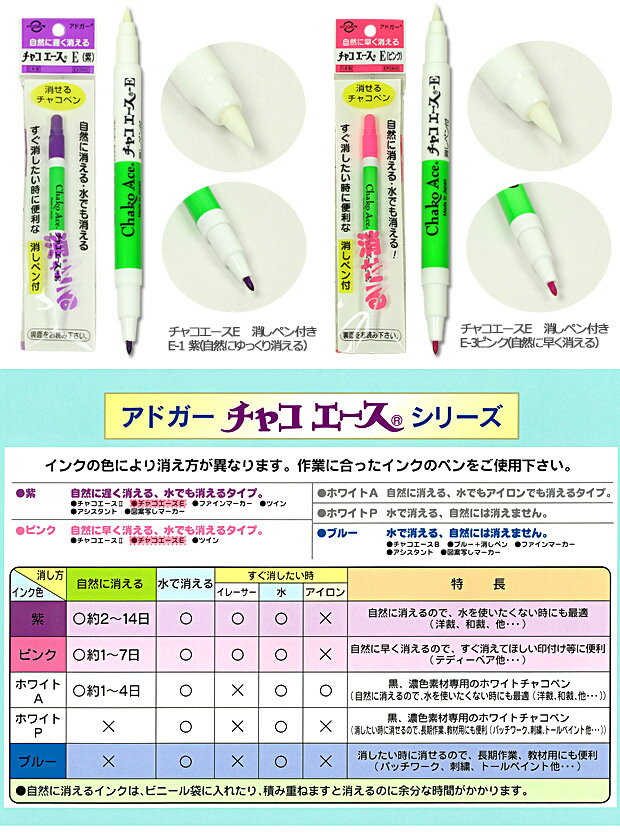 チャコエースE 消ペン付き|アドガー 印付け 自然にゆっくり消えるチャコペン 自然に早く消えるチャコペン 手作り