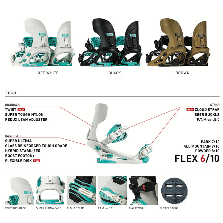 メーカー希望小売価格はメーカーカタログに基づいて掲載していますレビュー特典の詳細内容はこちらをご覧ください。■CX高い速度域でのトリックやカービングでのスタイルに特化したモデル。内側は極限まで膝を入れやすい可動域と、外側はノーズ/テールへの反応を出すためのねじれ形状にした新設計Twistハイバックと新素材ストラップとの組み合わせは新たなライディングフィールを感じさせてくれる。Wing形状のハイバックでもブーツを選ばない、ダイヤルカバー付属■FLUX海外のビッグフットライダーにしか合わないバインディングが主流だった時代1992年にFLUXは「日本人の足に合う究極のバインディング」をコンセプトに誕生しました。不快感や使い勝手の悪さ、痛み、耐久性など、様々な問題やストレスを無くして、ただただスノーボードを楽しみたい。我々はその思いに突き動かされ、徹底したモノづくりに情熱を注ぎ、目指したのは世界最高水準の品質でした。現在では世界25か国以上で展開するまでになり、掲げ続けているのは「PROMISED: Japan Quality」スノーボーディングの急速な変化に対応するため、国内外のライダーからの貴重なフィードバックを取り入れながら、斬新なアイデアや革新的な機能・技術を駆使しています。FLUXは原点を忘れることなく、常に最適化を追求し、スノーボーディングの魅力を提案し続けていきます。 ※社会情勢によっては納期が遅れる可能性がございます。 HIGHBACK -Twist:Wingの良さを残しながら足首の可動域を極限まで追求したカタチ。ハイスピードでの切り返し、スタイルの出し易さは唯一無二。 -Super Tough Nylon:低速から高速、ビギナーからエキスパートまでオールラウンドに対応するミディアムフレックス素材。 -Redux Lean Adjuster:小型化により軽量化。ワンアクションで簡単に調整可能に。 -Micro Adjuster:1メモリ前に移動させると約2.5度前傾する。より細かいハイバックセッティングが可能。 BASEPLATE -Super Ultima:ボードの弾きを最大限に活かすため、パワー伝達を反発力へ変換するスタビライザーを搭載したFLUXの新世代スタンダード。 -Glass Reinforced Tough Grade:最もオールラウンドに使えるミディアムフレックス。あらゆるライディングシーンに対応。 -Toolless Lever:工具がなくてもベストなセッティングが可能。ストッパー付でネジの緩みも防止。 -Adjustable Toe & Heel Cushion:ブーツサイズやボード幅に合わせた調整が可能な可動式クッション。 -Hybrid Stabilizer:内側には膝を入れやすくクッション性のある素材、外側には踏み込みやすく反発力の高い素材を採用した。 -5Holes Highback Rotation:両足前振り角度でのローテーションが可能な5つのハイバック取付穴。 -Boost Foot On+:センターが柔らかい素材になっており、踏み込むと自然とコンケーブ形状になり、トーとヒールが踏む混みやすくなる。もちろん表面には雪の付きにくい素材を採用。 -Flexible Disk:スタイルや操作性を高めるため、足下からフレキシブルさを出す柔軟性のあるロータリーディスク。 STRAP -Cloud Strap:まるでなにも付けてないかのような快適な装着感でありながら、ターンに対してしっかりと反発してくれる新素材発砲クッション採用。 -Beer Buckle:最後の一締めまで確実に締め上げる新設計ラチェットバックル。乾杯のときに困らない栓抜き機能付き。 -F.T.M. Ver.5.0:力の伝達力を高めるべく、センターのラインは強度を持たせ、上下の両端は柔軟性を高めブーツとのフィット感を高めたTransfer専用ストラップ。 -UU Fit:アンクルストラップの取付位置をヒールカップ内側にすることで、締込み圧力を足首の360°全周を包み込むよう均一化して、より自然なホールド感が得られる。 *商品ページの画像はメーカー画像を使用しております、余儀なく仕様の変更、多少のカラー変更がある場合がございます、あらかじめご了承下さい。