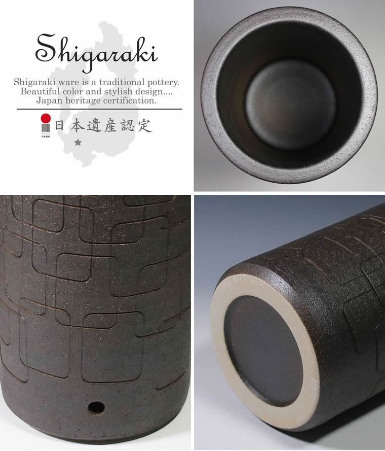 品 番 kt-9002 品 名 信楽焼 黒釉彫模様傘立て サイズ・重量 幅215×奥行215×高さ460mm重さ:7.5kg ※手づくりの為、形状、サイズ、色合い等に多少の違いは御座います。 送料について この商品は、送料無料になります。 ※ただし、沖縄、離島、一部地域は800円掛かります。 お支払手数料(代引、コンビニ、郵ちょ手数料)は、 無料になります。 傘立てについて 暮らしに調和し、さり気なくこだわる。玄関先がひと きわ際だつ信楽焼のかさたて。 無造作に入れられて傘を包み込んでしまう焼き物の 存在感。 信楽焼ならではの微妙な美しさが際立つカサ立て。 玄関に豊かな表情をつくりだし、住む人のこだわりが 伝わってくるインテリアです。 土ものですので重量感もあり飽きのこない傘立てです。 和風、洋風どちらにもさりげなく置けそうです。 ギフト包装について ギフト包装、のし、メッセージカードは、無料にてさせて 頂きます。詳しくは、下記をクリックして下さい。 ギフトにもお勧めの信楽焼傘立です。新築祝、結婚祝、 開店祝、還暦祝、記念品などにもお勧めです。 ギフト包装サービスについて傘立ての一覧ページはコチラ