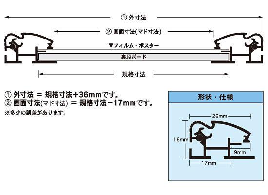 商品詳細を選択■サイズ:B1B1B2B3B4A1A2A3A4ポスターサイズOG菊全画用紙四ツ切画用紙八ツ切■カラー:シルバーシルバーブロンズホワイトブラックポップフレーム B1 シルバーフロント オープンパネル(Wリング方式) ■ポップフレーム カラーバリエーション・コーナー部・オープン時 ■ポップフレーム 外寸・画面寸法の目安・形状・仕様 ■ポップフレーム 壁面に直接固定する場合 商品スペックカラーシルバー規格サイズB1 ポスター寸法728×1030mm画面寸法711×1013mm外枠寸法764×1066mmフレーム材質アルミ形材重量2600g付属品ヒモと金具、ビス商品説明 フロント オープンパネル(Wリング方式) 開けやすく閉めやすいダブルリング方式! 壁へ直接取り付けたまま入れ替えができる! ▼カラー : ※お選びください ・シルバー ・ブロンズ ・ゴールド ・ホワイト ・ブラック ■サイズ(規格寸法):728×1030mm ■重量:2600g ■使用方法 1.フレームを外側へ回転させると開きます。(※手をはさまぬ様、十分に注意して下さい)4辺のフレームを全部開き、ツマミを持ってフィルムを持ち上げはずします。 ■壁面に直接固定する場合 フレームを開くとレール部分にビス止め用の穴があります。 壁面の材質に合った市販のビスをご使用になり、固定してください。 ※固定の際、強度は充分ご確認下さい。