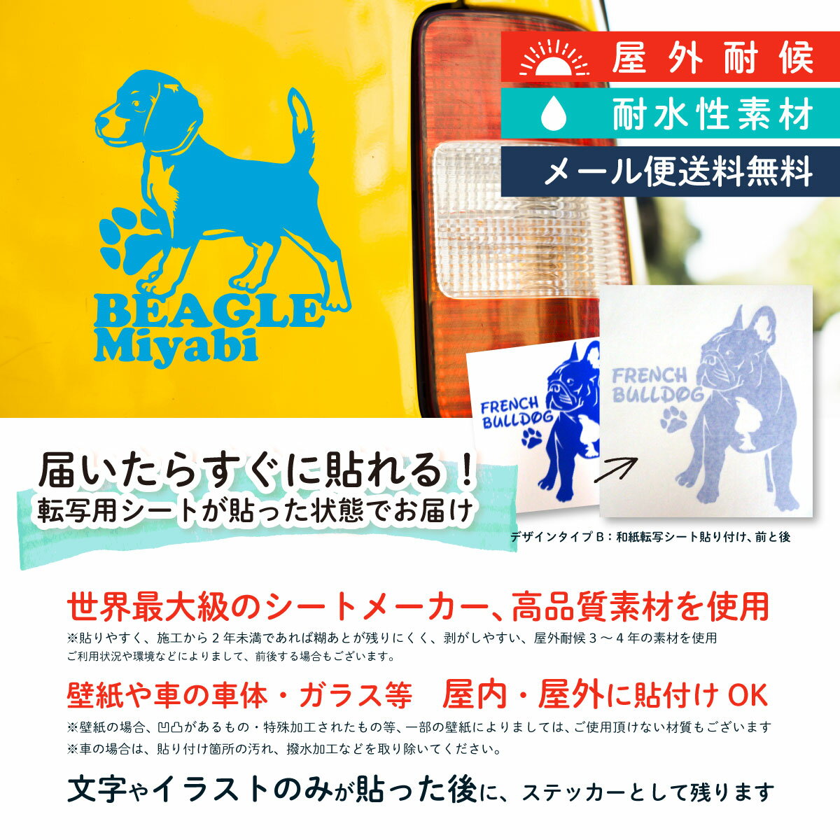 ステッカーサイズ 約 18cm メール便【送料サービス】 色を選んでください。 ワンちゃんの向きも選べます。 内貼りやマグネットシート追加ご希望は備考欄にご記入ください。 サイズ変更はお問い合わせください。 -----------当店が選ばれる5つの理由----------- 1.自社デザイン、自社製作のプロショップ、 カッティング専門店です。 2.実店舗での経験豊富な店長、スタッフによる 親切丁寧で早い対応力。 3.オリジナルデザインだから当店オンリー! ここにしか無い! 4.デザイン自慢!見るたびに思わず微笑む、 しあわせステッカー。 5.オーダー製作だから出来る、 お客様だけのために個別編集。 ------------------------------------------------ --------------この商品だけの魅力--------------- ●とにかく可愛い、オリジナルデザイン。 ●記念日などのプレゼントにも珍しくてピッタリ。 ●贈ってもらって、お互い笑顔いっぱい。 ●たくさんのカラーから選んで作れる。 ●オーダー製作なのに早い、満足価格で高品質。 ●カッティング、転写式だからフチなしで綺麗。 ------------------------------------------------- マットカラー ( つや消し ) 12色 マットホワイト マットレモン マットイエロー マットオレンジ マットレッド マットマゼンタ マットピンク マットライトブルー マットモカ マットグレー マットシルバー マットゴールド ホワイト 白 レモン イエロー 黄 オレンジ レッド 赤 マゼンタ ピンク ライトブルー モカ グレー シルバー 銀 銀色 ゴールド 金 金色 【きれいに剥がせます】ノリ残りなくはがせるから安心です。 超長期使用の場合ノリが硬化し剥がしにくくなる場合があります。 お友達へ両親へ子供へ、何気ないプレゼントに喜んでもらえます。 貼ると自分のお車の可愛い目印になります。 オリジナルデザイン自社製作です。 貼付作業は難しいことは全くありません。 もちろんアドバイスもいたしますし、 慎重に丁寧に作業さえしていただければ問題ありません。 お気軽にご相談下さい。mail:ootsuka@fujikoubou.comビーグル ステッカー デザイン ビーグル デザインタイプ ビーグル 色見本 お気軽にご相談下さい。 mail:ootsuka@fujikoubou.com