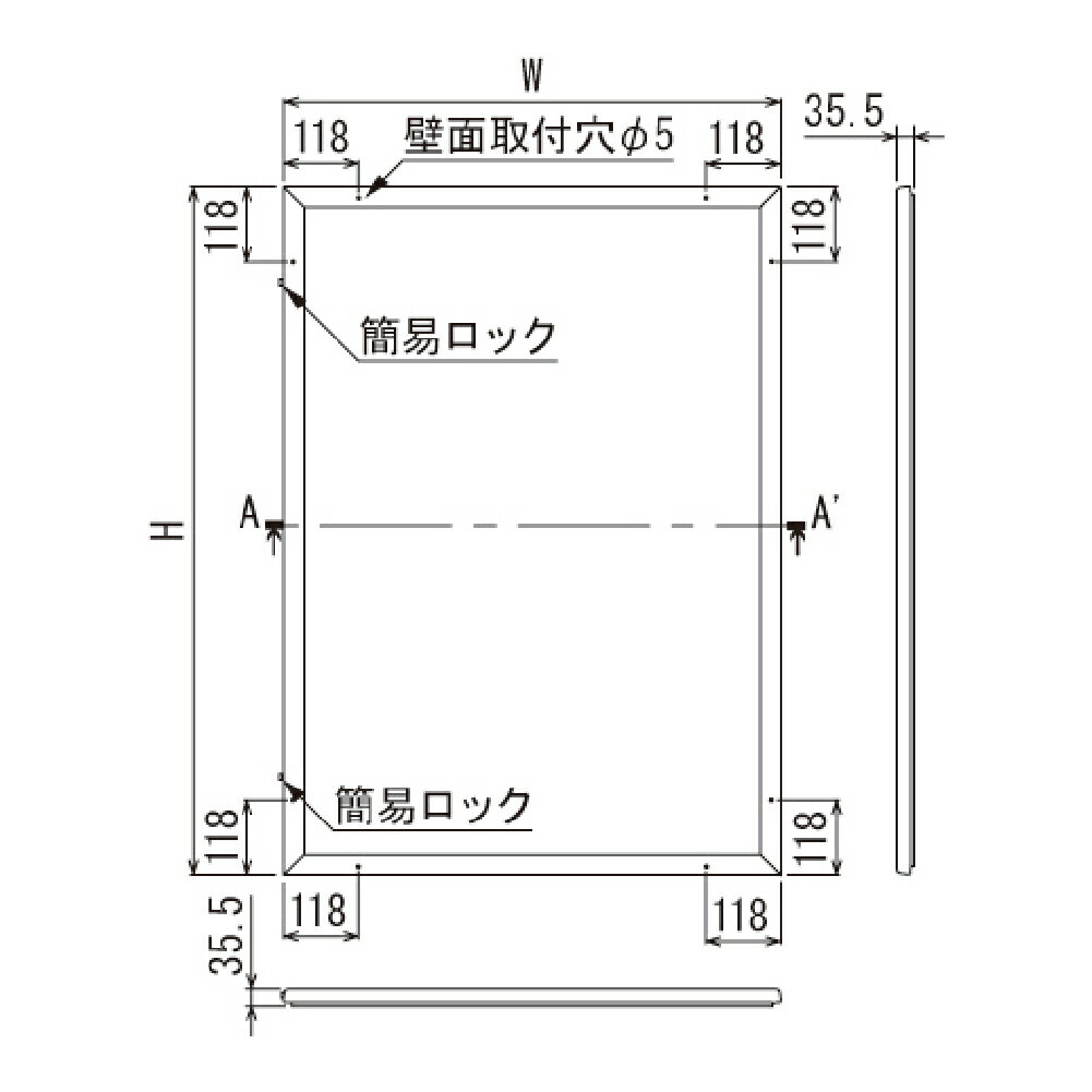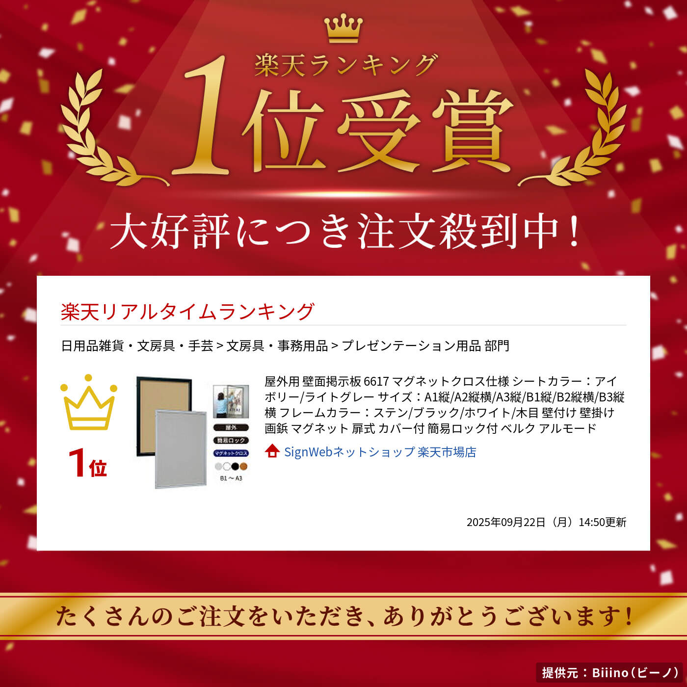 屋外で使える掲示板「6617 マグネットクロス仕様」屋外対応の薄型壁面掲示板です。 アクリルの透明カバーが付いた扉を開け閉めして、簡単に掲示物が交換できる扉式掲示ボックス。 薄型でスタイリッシュな高級感のあるハイクオリティな見た目です。 屋外でも安心の簡易ロックを標準装備しています。 マグネットと画鋲が使用できる「マグネットクロス」タイプです。壁面掲示板6617の掲示面は3種類から選べます★こちらのページは、「マグネットクロス仕様」です★ (マグネットと画鋲が使用可能)掲示シート仕様 (画鋲が使用可能) ※画像クリックで商品ページを開くホワイトボード仕様(ボード用マーカーとマグネットが使用可能) ※画像クリックで商品ページを開くマグネットクロス仕様 カラーバリエーションマグネットクロス「アイボリー」と、ステン、木目、ブラック、ホワイトのフレームカラーの組み合わせです。マグネットクロス「ライトグレー」と、ステン、木目、ブラック、ホワイトのフレームカラーの組み合わせです。サイズ 外寸法 W×H×D(mm) 有効画面寸法 W×H(mm) 重量(kg) ※参考:掲示シート仕様 B1タテ 809×1111×35.5 738×1040 8.5 B2タテ 596×809×35.5 525×738 5 B2ヨコ 809×596×35.5 738×525 5 B3タテ 445×596×35.5 374×525 3.1 B3ヨコ 596×445×35.5 525×374 3.1 A1タテ 675×922×35.5 604×851 6.3 A2タテ 501×675×35.5 430×604 3.7 A2ヨコ 675×501×35.5 604×430 3.7 A3タテ 378×501×35.5 307×430 2.4 使用方法 ※取付・設置は行っておりません。お近くの工務店様等へご依頼下さい。 ※安全面と水抜き穴の関係で、タテ・ヨコ90度回転や上下逆ではご利用いただけません。 ※屋外仕様ですが完全防水ではないため、雨が直接当たらない屋根付きの場所での設置を推奨しております。 ※壁面の状態により必要な部材が異なります。取付け等は工務店および看板業者様にご相談ください。