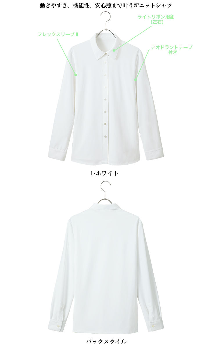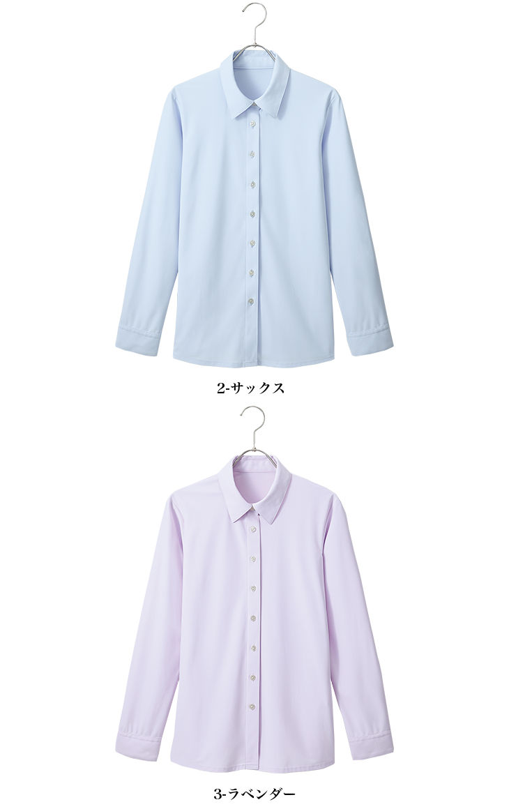 High-Spec BLOUSES ※こちらはシャツ単品の販売です。 ハイゲージ・フルダルトリコット 動きやすさ、機能性、安心化まで叶うニットシャツ。 商品の特徴 ❚安心の防透性、なめらかな風合い ❚洗濯後の乾きが速く、ノーアイロンでOK ❚抜群のストレッチ性で働きラクラク ❚高通気性でムレ感やべたつきナシ ❚紫外線カット性(紫外線遮蔽率90%以上) 素材 ハイゲージ・フルダルトリコット 混率 ポリエステル100% カラー 1-ホワイト/2-サックス/3-ラベンダー/4-シェルピンク サイズ 19号〜23号 ※原則、受注生産ですが数量によっては短納期でご用意できる場合がございます。 お気軽に在庫をお問い合わせ下さい。 5号〜17号はこちら *サイズ表は最終画像をご覧ください。 機能 【ホームウォッシャブル】:ご家庭でのお洗濯が可能です。 【ノーアイロン】:お洗濯後、干すだけで、シワのないキレイな状態を保ちます。 【ニット】:伸縮性とイージーケア性に富んだ編み地素材です。 【吸汗・速乾】:汗の吸収が良く、早く乾いてべタつきの少ない素材です。 【防透性】:透けにくい素材です。 【紫外線カット】:紫外線を通しにくい素材です。 【フレックスリーブ2】 【長袖口ダブルボタン】 【デオドラントテープ】 【台衿】 【ライトリボン対応】 一般企業(生保、銀行、デパート、金融機関の受付、窓口、学校、病院の会計事務など) お得情報