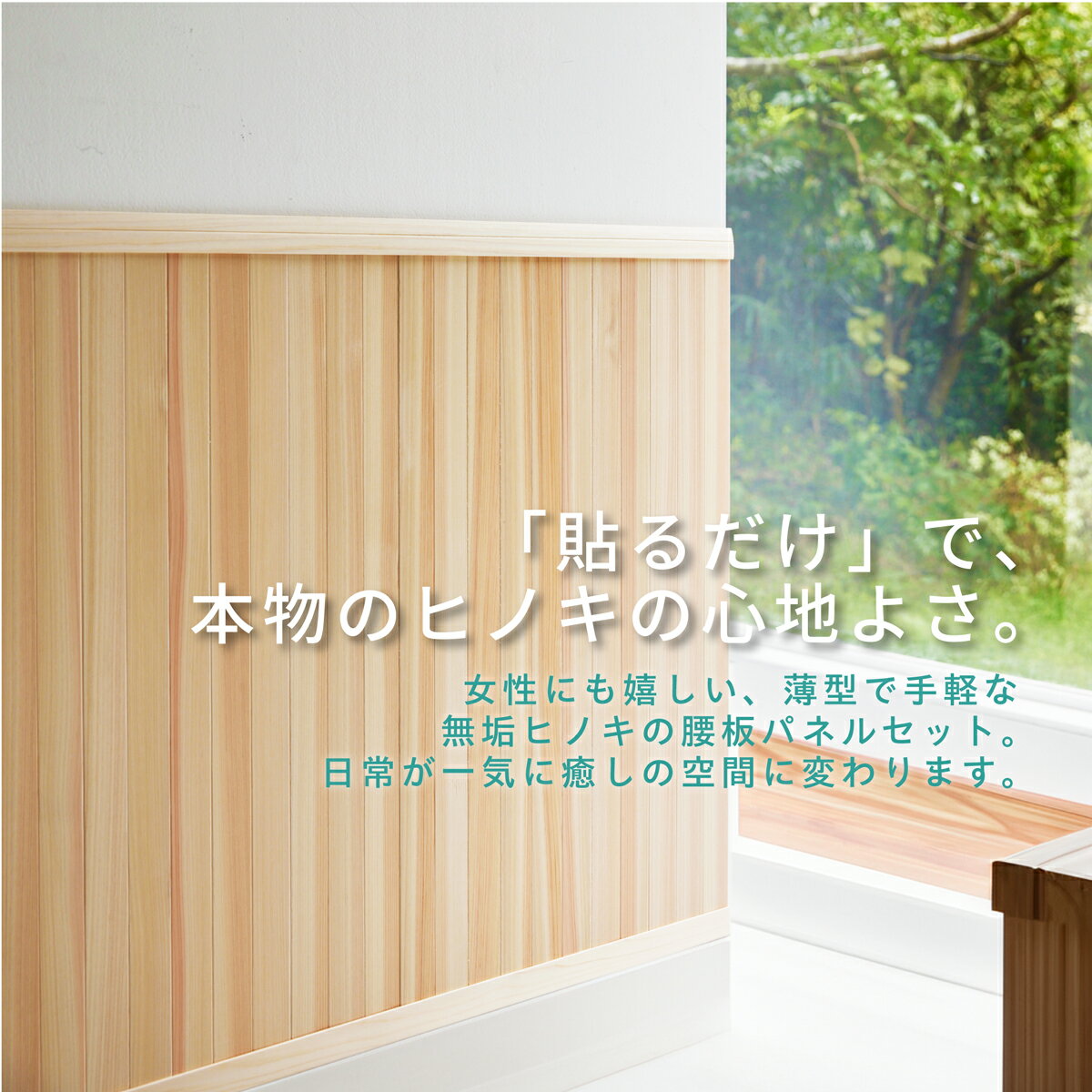 ■商品について 素材四国産ヒノキ(桧 檜 ひのき)柾目板 愛媛県・高知県産材仕様・特徴国産材 日本製 天然乾燥材 無塗装 無垢材 表面カンナ仕上げ用途屋内用 リフォーム 賃貸 簡単diy 簡易施工 猫の爪とぎ跡隠し開発への思い「diyには自信がないけど、私にも腰板の施工はできるでしょうか?」これまでたくさんのお客様から頂いたそんなご相談をきっかけに「貼るだけ施工」の腰板パネルを開発しました。無垢材には「反り・縮み」のリスクがつきものですが、このパネルは希少で高品質な「柾目板」を厳選することで、貼るだけ施工に大敵な「反り・縮み」のリスクを低減できるよう工夫しています。この腰板パネルセットで、これまでdiyを諦めていた皆様にも、国産ヒノキのお部屋の心地よさをお楽しみいただければ幸いです。 私たちは、木のモノが身近な選択肢の一つに加わることで、森林環境への思いを育むきっかけづくりになればと考えています。※商品について●天然の木材を使用しておりますため、木目や色味は一つ一つ異なります。 ●お使いいただくうち、木材の経年変化として、色合いは深みを増していきます。 ●反り・縮みが起こりにくい性質の木を使用していますが、無垢材のため、完全にそれらのリスクをゼロにはできませんので、ご容赦ください。 ●無垢材のため、表示寸法との誤差(3mmまで)が生じる場合がざいます。※貼り付けの際のご注意【原状回復が必要な場合】 ●壁面の油分、水分、ゴミなどを十分取り除いた後、貼り付け面の素材に合ったマスキングテープで下張りしてください。 ●接着面が発砲している塩ビクロスの場合、マスキングテープを剥がす際にクロス表面が傷つきやすいのでご注意ください。 【原状回復が必要ない場合】 ●壁面の油分、水分、ゴミなどは、十分取り除いた後、壁面に直貼りしてください。 ●建築用の強粘着両面テープを使用しています。剥がす際には貼り付け面を傷めたり、のり残りする場合がありますのでご注意ください。 ●両面テープはクッション性に優れた厚みがある基材を使用していますので、多少の粗面やコンクリート面にも対応できます。ただし、砂壁や劣化した壁など、壁面の表層が脆い壁には使用できません。 ●貼るだけの簡易施工です。長期間の使用により剥がれなどの不具合が起きた際には、貼り直し等のご対応をお願いいたします。 ●壁面の種類によっては両面テープが不適合である場合も考えられますので、目立たない場所で問題ないことをご確認の上ご使用下さい。 サステナブルな取り組み この商品は、適切に育てられた地域の森林から伐採された桧を使用しています。地域の森林資源を適切に活用することで、森林の健全な管理と再生を支援し、生態系の保護にも貢献します。また、地域産材を活用した商品を通じて、持続可能な社会づくりに貢献し、森と社会をつなぐ架け橋となることを目指しています。 納期について 当商品は、最適な状態でお品物をお届けするため、受注後に仕上げ加工を行う「半受注生産品」です。このため、ご注文内容によって納期が変動することがありますので、あらかじめご了承ください。 ※正確な出荷日は、ご注文後に発送するご案内メールでお知らせいたします。 ※お急ぎの場合など、事前に納期確認が必要な際は、お問合せフォームからご希望の商品と数量をご連絡ください。お問合せ時点での最短納期をご返信いたします。 製造元四国加工株式会社