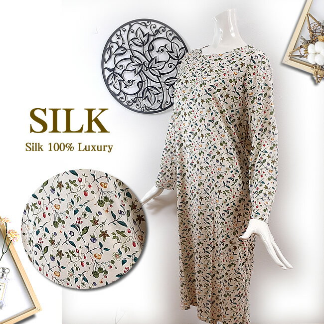 サプライズ価格【40%OFF】シルク100%長袖ワンピースネグリジェ【人気の木の実柄】【リラックスタイムのアイテムに】