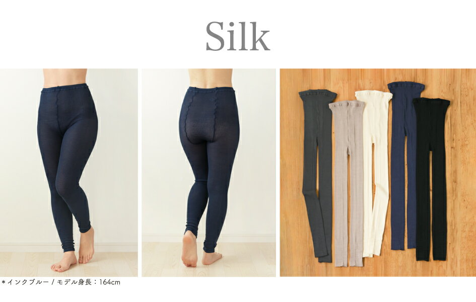 ■入荷のお知らせ■(2025年11月14日) 2025年11月19日(水)午後2時頃【ペールチャコール】 どうぞよろしくお願いいたします。 ※予定は変更となる可能性がございます。 ■丈違い商品のご案内 高身長さん向け シルクリブスパッツ > ■商品名 シルクリブスパッツ■色黒・生成・ペールチャコール・ペールベージュ・インクブルー■サイズ 1.目安サイズ/フリーサイズ:S〜L 置き寸(周囲)/引っ張り寸(周囲) 2.ウエスト 24cm(48cm)/74cm(148cm) 3.ヒップ 18cm(36cm)/74cm(148cm) 4.股上 30cm 5.股下 75cm 6.足口 9cm(18cm)/30cm(60cm) ※サイズ絵とサイズ表の数字は対応しています。※サイズ計測方法についてはこちら■重さ ・重さは、約82gです。 (天然繊維のため、多少前後いたしますことどうかご了承くださいませ。他製品との比較の目安にしていただけましたら幸いでございます。)■素材 絹70%(生成のみワイルドシルク) ナイロン30%■洗濯方法 中性洗剤で手洗い、風通しの良い所で陰干し※縦方向に引っ張り、形を整えて干してください。■生産地 日本製(生地・縫製:奈良県)■その他 ・リニューアルいたしました(2022年12月21日)。素材をウォッシャブルシルクへ変更し、よりふんわりとした風合いになりました。・ウエストゴムは入れ替え可能です。・縫い目は股上のマチ部分のみで、脚部に縫い目はございません。・製品の仕様上、左右の脚部の長さに5cm前後の差がある場合がございます。どうかご容赦くださいませ。・お洗濯や時間経過で、10%前後の範囲で縮む場合がございます(濃色の方がより縮みやすいです)。・天然繊維のため、編み上げ後は生地厚感に違いが出ることがございますが、お洗濯後は同じになります。どうかご安心くださいませ。・天然繊維のため、気候やロット・色等により、サイズ・縮率や色味が多少異なる場合がございます。・天然繊維のため、重ねて着用される衣服の素材等によって、毛羽、毛玉が付く場合がございます。・お使いのモニタや環境設定によって、色味が実際の製品と異なって見える場合がございます。・モデル身長:163〜165cm/体型:やややせ型〜標準■コメント 滑らかさ抜群のシルクスパッツが出来上がりました! リニューアル前に比べてよりふんわりと、足入れした途端に優しい肌触りが伝わってくるスパッツに出来上がりました。 カラーバリエーションも増え、心地良くファッションも楽しんでいただけます。 生成のみワイルドシルクを使用しており、他のお色に比べて少しだけシャリ感のある肌触りになっております。 柔らかくて、細身なのにゆ〜ったりした感覚で履いていただけます。 Sサイズの方から、Lサイズの方まで大丈夫です。(実はLLサイズのスタッフも履けます!) 生地の厚さは、シルクリブスパッツの方が絹コットンスパッツよりも、薄地です。 そのまま履いてもとても心地よいのですが、お肌の弱い方や、縫い目が気になる方は、裏返して履いていただくことをおすすめします。 ピッタリしたタイトなボトムスのインナーとしてもご利用いただけますし、 おしゃれにチュニックの下に履いていただいても良いかと思います。 よろしくお願いします。