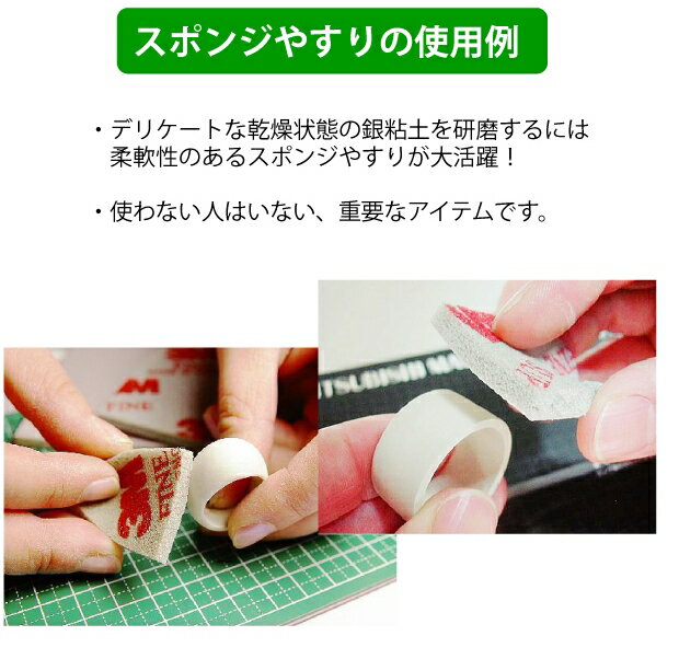 スリーエム社のミネラルテクノロジーにより開発された柔軟で耐久力のあるスポンジ研磨剤です。 シルバークラフトのなどの曲面の多いサンディングに適しています。乾燥状態の銀粘土の場合はFINE(赤)のみで大丈夫です。焼成状態の銀粘土の場合は順番に全種類必要です。素敵な作品を作るためにこまめに新しいものにしましょう!・大きさ114mm×140mm、厚さ5mm ・MIDEAM(赤) #120〜 180相当…すごく粗い ・FINE(赤) #240〜 320相当…粗い ・SUPER FINE(赤) #320〜 600相当…やや粗い ・ULTRA FINE(青) #800〜1000相当…やや細かい ・MICRO FINE(緑) #1200〜1500相当…細かい ◆メール便対応できます。