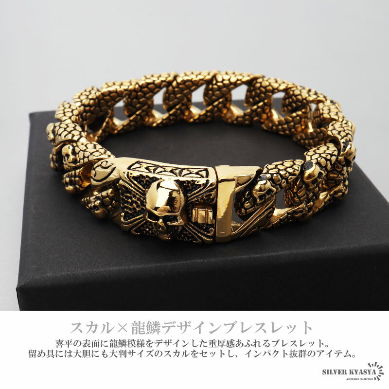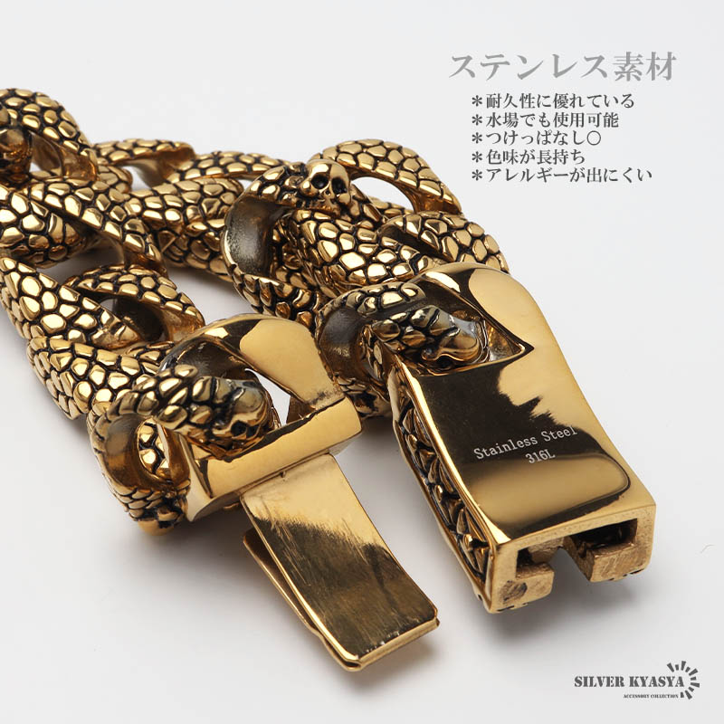 重厚 チェーンブレスレット メンズ スカル スネークチェーン 喜平チェーン ゴールド 金 ごつめ ステンレス 316L 付けっぱなしOK 喜平ブレスレット 極太 ワイドブレスレット 父の日