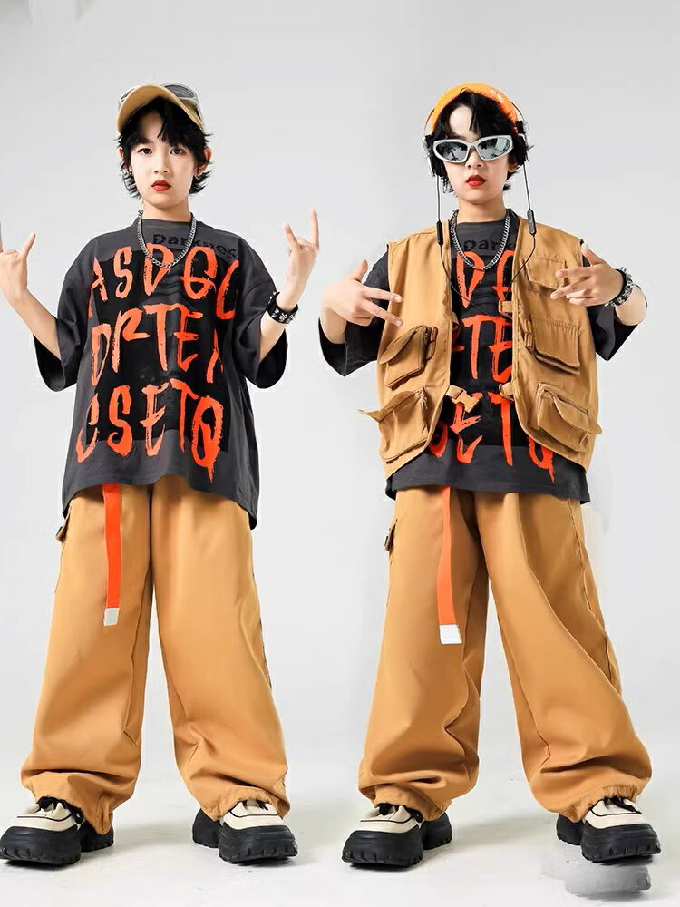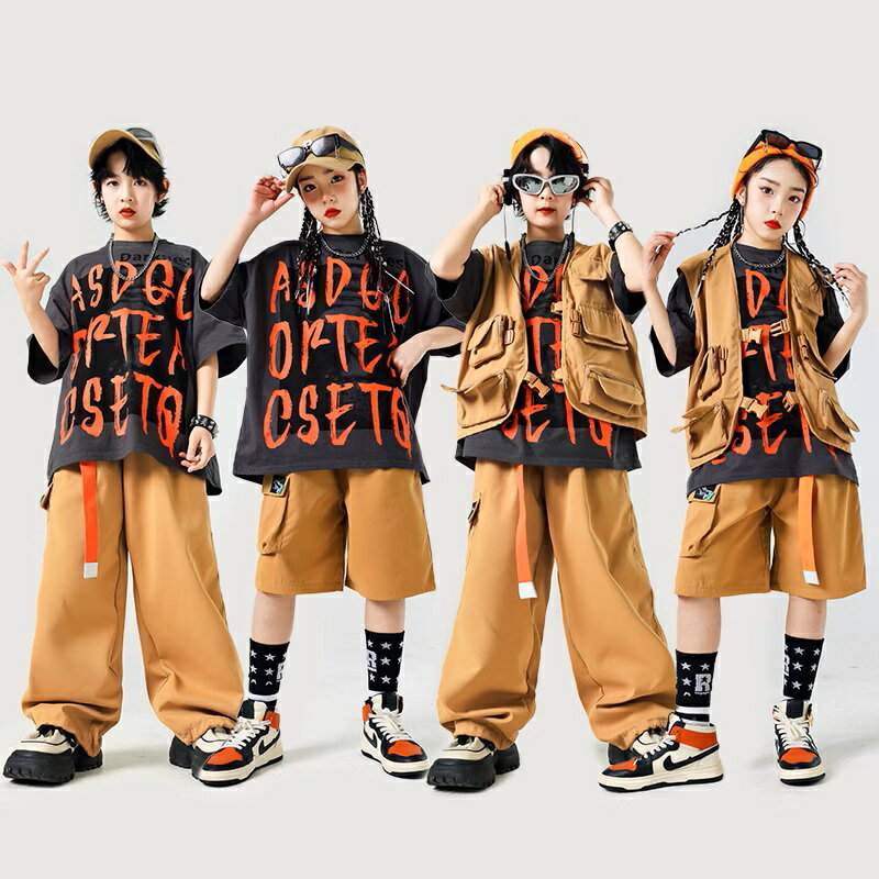 ヒップホップ ダンス衣装 セットアップ Tシャツ フィッシングベスト パンツ キッズダンス衣装 子供ダンス服 ダンスウェア 韓国 K-POP グレー ベージュ