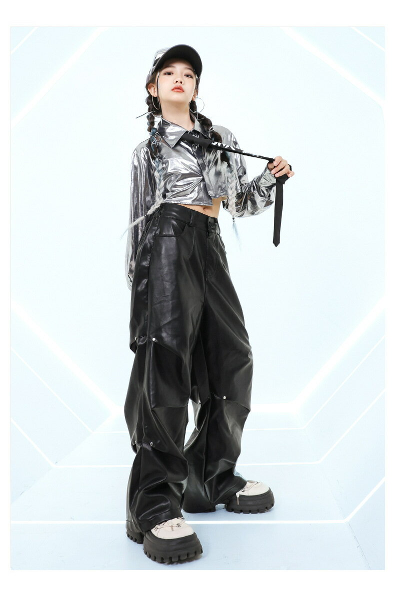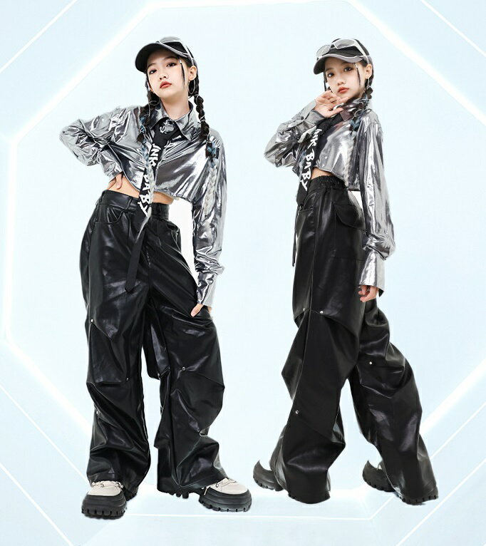 キッズダンス衣装 銀 黒 制服 K-POP 韓国 ヒップホップ 衣装 派手 ダンス衣装 キッズ セットアップ シルバー メタリックシャツ ガールズ シャツ レザー調パンツ