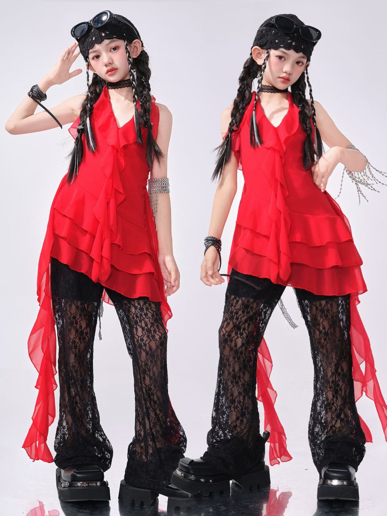ダンス衣装 赤 黒 ジャズ ヒップホップ ガールズ チュニック レースパンツ ダンスウェア キッズダンス衣装 セットアップ かっこいい K-POP 韓国
