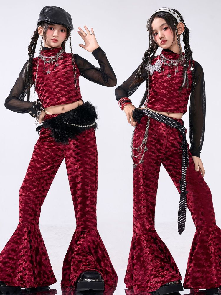ダンス衣装 赤 黒 ジャズ ヒップホップ ガールズ シースルー トップス フレアパンツ ダンスウェア キッズダンス衣装 セットアップ かっこいい K-POP 韓国 マーメイド