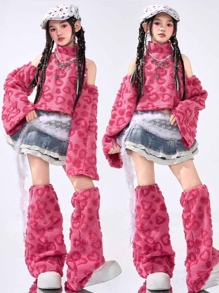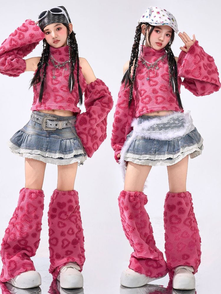 K-POP ダンス衣装 韓国 キッズダンス衣装 ガールズ セットアップ 子供ダンス服 ダンスウェア ダンス衣装 ハート柄 もこもこトップス スカート デニムパンツ ピンク イエロー