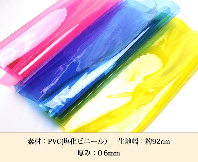 素材 PVC(塩化ビニール) 生地巾 約92cm 厚み 約0.6mm メール便 不可 注意事項 【クログレー・ベージュを同時購入のお客様へ】 こちらの生地は紙管に巻いてのお届けの為、巻いた状態ですと、見分けがつきにくいことがございます。 商品が届いた際は白い紙を下に敷いた状態で、一度広げてお色をご確認下さいませ。0.6mm色透明シート(3231)【メール便不可】 鮮やかなカラーが素敵な色透明シート! プールバッグやトートバッグ、ポーチにぴったりの透明シート 切りっぱなしでもほつれず、端処理は必要ありません。 柄のある裏地と合わせると柄が透けて見えて違った雰囲気を楽しめます。 カラーは使いやすいクリアからビビットなカラーまでご用意いたしました。 オリジナルのクリアシリーズに挑戦してみていかがでしょうか。 コスプレ,雑貨,イベント,ハロウィン