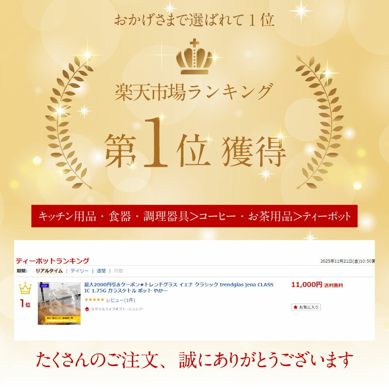 ≪trendglas jena トレンドグラスイエナ CLASSIC G 1.75L≫"トレンドグラス イエナ"のクラシックGは、ドイツの職人が手掛ける、どこか懐かしさを感じる耐熱ガラスケトルです。1.75Lという大容量は、家族みんなでのお茶の時間や、来客時のおもてなしにもぴったり。透明なので、お湯が沸く様子や茶葉が踊る様子を目で見て楽しむことができます。ガス火にかければ、ガラス越しに見える炎と沸騰する泡が、ゆったりとした時間を演出。電子レンジや食洗機にも対応しているので、お手入れも簡単です。(※蓋は非対応)無駄のないシンプルなデザインは、どんなキッチンにも自然と馴染み、長く愛用できること間違いなし。毎日の暮らしに、ほっと温かいひとときを添えてくれる、そんなポットです。Trendglas-Jena/(トレンドグラス・イエナ)トレンドグラス・イエナは、ドイツの耐熱ガラスメーカーです。1920年にドイツ・イエナで開発された耐熱ガラス「イエナグラス」は、その優れた品質から瞬く間に家庭用品として普及し、耐熱ガラスの代名詞となりました。2005年に前身となるSchott Jenaer Glas社での生産が終了しましたが、Trendglas Jena社がデザイン、金型、設備を引き継ぎ、現在も伝統と品質を守りながらイエナグラスの生産を続けています。ドイツとハンガリーに工場を持ち、ヨーロッパメイドの確かな品質を誇ります。【サイズ】約220×164×162mm【素材】ホウケイ酸ガラス(耐熱ガラス)【容量】1.75L【原産国】ハンガリー【対応】直火(ガスコンロ)、電子レンジ、食洗器 ※蓋は非対応です。【その他】海外からの輸入製品のため、パッケージならび本体に若干の傷や汚れなどがある場合がございます。細かな傷や、プリントが剥げている箇所がある場合がございます。製品仕様としてご了承いただきました上で、ご購入くださいますようお願いいたします。【注意】※IHではご使用いただけません。※空焚きはしないでください。※ストーブの上では使用しないでください。≪trendglas jena トレンドグラスイエナ CLASSIC G 1.75L≫"トレンドグラス イエナ"のクラシックGは、ドイツの職人が手掛ける、どこか懐かしさを感じる耐熱ガラスケトルです。1.75Lという大容量は、家族みんなでのお茶の時間や、来客時のおもてなしにもぴったり。透明なので、お湯が沸く様子や茶葉が踊る様子を目で見て楽しむことができます。ガス火にかければ、ガラス越しに見える炎と沸騰する泡が、ゆったりとした時間を演出。電子レンジや食洗機にも対応しているので、お手入れも簡単です。(※蓋は非対応)無駄のないシンプルなデザインは、どんなキッチンにも自然と馴染み、長く愛用できること間違いなし。毎日の暮らしに、ほっと温かいひとときを添えてくれる、そんなポットです。Trendglas-Jena/(トレンドグラス・イエナ)トレンドグラス・イエナは、ドイツの耐熱ガラスメーカーです。1920年にドイツ・イエナで開発された耐熱ガラス「イエナグラス」は、その優れた品質から瞬く間に家庭用品として普及し、耐熱ガラスの代名詞となりました。2005年に前身となるSchott Jenaer Glas社での生産が終了しましたが、Trendglas Jena社がデザイン、金型、設備を引き継ぎ、現在も伝統と品質を守りながらイエナグラスの生産を続けています。ドイツとハンガリーに工場を持ち、ヨーロッパメイドの確かな品質を誇ります。サイズ約220×164×162mm素材ホウケイ酸ガラス(耐熱ガラス)容量1.75L原産国ハンガリー対応直火(ガスコンロ)、電子レンジ、食洗器 ※蓋は非対応です。その他海外からの輸入製品のため、パッケージならび本体に若干の傷や汚れなどがある場合がございます。細かな傷や、プリントが剥げている箇所がある場合がございます。製品仕様としてご了承いただきました上で、ご購入くださいますようお願いいたします。注意※IHではご使用いただけません。※空焚きはしないでください。※ストーブの上では使用しないでください。