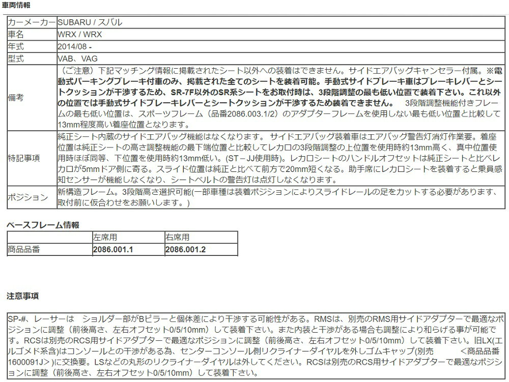 【メーカー名】RECARO/レカロ【適合車種】スバル WRX【年式/型式】2014.08〜2021.01/VAB VAG/【商品名】純正ベースフレーム シートレール 右席用【セット内容】-【塗装/未塗装】-【カラー】-【素材】-【特記事項】※メーカー受注生産品のため基本、納期2〜3週間程お時間を頂いております。(長期休み等により3週間以上納期がかかる場合もございます)※受注生産品のためオーダー後のキャンセルや品番変更はお受けできません。お間違えの無いようご注文前にメーカーHPをご確認頂きますようお願い致します。【備考】(ご注意)マッチング情報に掲載されたシート以外への装着はできません。サイドエアバッグキャンセラー付属。※電動式パーキングブレーキ付車のみ、掲載された全てのシートを装着可能。手動式サイドブレーキ車はブレーキレバーとシートクッションが干渉するため、SR-7F以外のSR系シートをお取付時は、3段階調整の最も低い位置で装着下さい。これ以外の位置では手動式サイドブレーキレバーとシートクッションが干渉するため装着できません。 3段階調整機能付きフレームの最も低い位置は、スポーツフレーム(品番2086.003.1/2)のアダプターフレームを使用しない最も低い位置と比較して13mm程度高い着座位置となります。【特記事項】 純正シート内蔵のサイドエアバッグ機能はなくなります。 サイドエアバッグ装着車はエアバッグ警告灯消灯作業要。着座位置は純正シートの高さ調整機能の最下端位置と比較してレカロの3段階調整の上位置を使用時約13mm高く、真中位置使用時ほぼ同等、下位置を使用時約13mm低い。(ST−JJ使用時)。レカロシートのハンドルオフセットは純正シートと比べレカロが5mmドア側に寄る。スライド位置は純正と比べて前方で20mm短くなる。助手席にレカロシートを装着すると乗員感知センサーが機能しなくなり、シートベルトの警告灯は点灯しなくなります。【注意事項】SP-#、レーサーは ショルダー部がBピラーと個体差により干渉する可能性がある。RMSは、別売のRMS用サイドアダプターで最適なポジションに調整(前後高さ、左右オフセット0/5/10mm)して装着下さい。また内装と干渉がある場合も調整により和らげる事が可能です。RCSは別売のRCS用サイドアダプターで最適なポジションに調整(前後高さ、左右オフセット0/5/10mm)して装着下さい。旧LX(エルゴメド系含)はコンソールとの干渉がある為、センターコンソール側リクライナーダイヤルを外しゴムキャップ(別売<商品品番1600091J>)に交換要。LSなどの丸形のリクライナーダイヤルは外してください。RCSは別売のRCS用サイドアダプターで最適なポジションに調整(前後高さ、左右オフセット0/5/10mm)して装着下さい。【ポジション】新構造フレーム。3段階高さ選択可能(一部車種は装着ポジションによりスライドレールの足をカットする必要があります、取付前に仮合わせをお願いします。)【注意】こちらの商品は個人のお客様でもご注文は可能ですが、法人様住所のみお届け可能です。配送先入力欄より法人様の『住所・屋号・担当者・電話番号(固定電話のみ)』をご指定ください。2086.001.2【定価】28600円【納期】納期はメーカーの在庫や生産状況によって異なりますのでトラブル防止の為、必ず事前にお問い合わせ下さい。【送料/配送】■この商品の基本送料(本州、四国、九州)は【 送料無料 】となります。■北海道送料は【 1650円 】となります。(※北海道送料が掛る場合、会計時に自動計算されませんのでご注意ください。)※沖縄県/離島は別途お見積りさせて頂きますので、ご注文前に必ず送料の確認をお願いします。