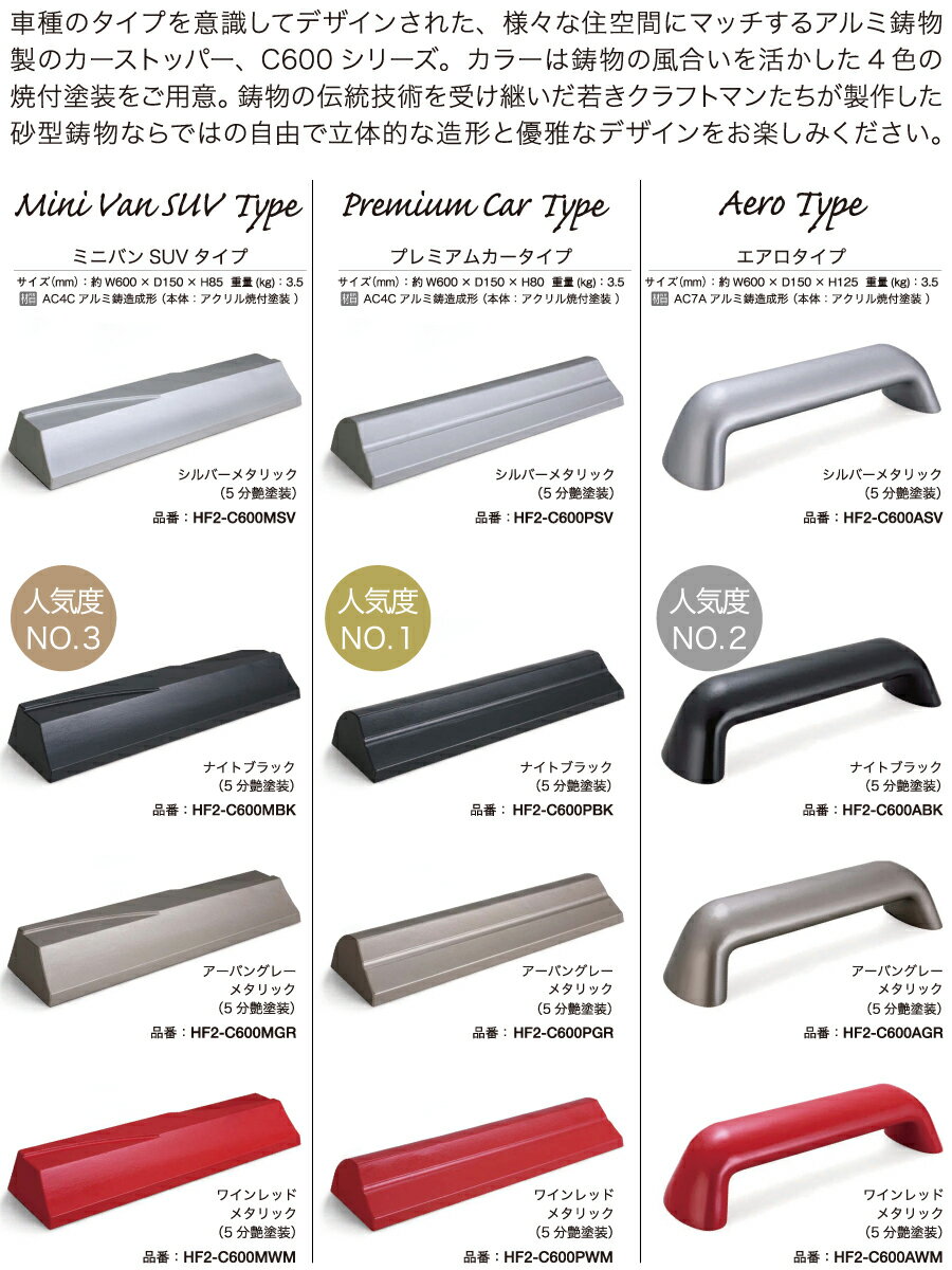 商 品 詳 細商品名【アルデコール カーストッパー C600 エアロタイプ シルバー ※1本のみ】オンリーワンクラブHF2-C600ASV 車庫まわり 駐車場 ガレージ カーストッパー 輪止め アルミサイズ(mm)約W600×D150×H125重量(kg)3.5kg(1本) ※砂型鋳造ハンドメイドのため、重量誤差が生じます。材質本体:AC7Aアルミ鋳造成形(ショットブラストブラッシュド焼付塗装)付属品ステンレス製ボルト:M16×100mm×2本付属 ※コンクリートボンドは付属しておりません。別途市販品をご用意願います。備考※沖縄・離島は別途送料が必要となります。事前にお問い合わせ下さい。 ※配送には約2週間程度必要となります。(欠品時は2〜4週間) ※砂型鋳造ハンドメイドのため重量誤差、鋳物特有の凸凹が生じます。 ※メーカー直送品の為、代引き決済不可。 ※代引きを選択頂いた場合は自動キャンセルをさせて頂きます。補足事項【お手入れと美観について】 ・本製品はアルミ鋳造成形です。素材そのものが持つ色調や質感をお楽しみいただけるよう、塗装はしておりません。 ・日光や雨に含まれる酸により、施工直後から約1か月で1トーン暗く変色します。これはアルミの表面がこれ以上腐食しないように酸化し、自然皮膜(酸化被膜)を生成するためです。本製品は、酸化被膜を自然形成する特性により、半永久的に経年変化をお楽しみいただける、天然鉱物性の製品です。 ・汚れが目立つ場合は、中性洗剤を含ませた金タワシで表面をこすってみてください。強くこすりすぎると、最初の肌合いが削り取れてしまいますので、あらかじめ目立たない場所でのテストをおすすめいたします。 ・色はアクリル焼付塗装となります。塗装の剥がれが気になる場合は、市販の近似色塗料でタッチアップしてください。禁止事項※車止めの用途以外でのご使用はおやめください。 ※本製品は車両用製品ですので、坂道や一般道でのご使用はおやめください。注意事項※設置場所はコンクリート面の上とし、薄いアスファルトや下地が柔らかい場所、砂地、砂利の場所は避けてください。 ※本製品は重量2t以上の大型車両用には対応しておりません。 ※本製品への車両の乗上げ、勢いよく車輪を当てるなどした場合、ぐらつきや破損の原因となりますので、運転には十分ご注意ください。 ※タイヤはゴムが主体です。タイヤ側面は特に剛性がなく、側面から当てるとパンクしたり裂ける場合があります。本製品によるこれらの損害は弁償やクレームの対象となりませんのでご承諾ください。 ※本製品は金属製品のため、夏場や直射日光下では表面温度が50度を超す場合がございますので、素手や素足で触れないでください。また、ペットのお散歩の際も十分気をつけてください。 ※本製品はアルミニウム生材仕上のため、素材色が少しずつ暗めに落ち着いていきます。また、日光や雨に含まれる酸により斑点や染みが発生しますが、これは人間でいうところのかさぶたの役割をする酸化被膜が生成されるためで、品質には全く問題ございません。素材そのものが持つ美観特性を生かした商品として、経年変化をお楽しみいただけると幸いです。施工について※施工はお客様にて責任を持ってご手配ください。 ※施工には、専門的な知識と、工具、技術が必要となります。 ※お近くの施工業者様に設置を依頼して頂くようお願い致します。 ※お近くの施工業者様に相談の上、設置を依頼して頂くようお願い致します。お庭に設置する屋外商品を多数取り揃えております。欲しい商品を見つけやすいよう様々な検索方法をご用意しております。 メーカー検索やカテゴリ検索で選べるエクステリア商品がいっぱい!ご不明な点がございましたらお気軽にお問い合わせください。↓↓まずは当店人気ランキングをチェック↓↓ ★当店人気ランキングはこちらから ●関連商品 オンリーワンクラブ アルデコール フルート ゴールドエディション 1本のみ 29,900円オンリーワンクラブ アルデコール フルート ゴールドエディション エンドキャップレーザー刻印タイプ 1本のみ 37,400円オンリーワンクラブ アルデコール フルート カーボンブラックディション 1本のみ 29,900円オンリーワンクラブ アルデコール フルート カーボンブラックエディション エンドキャップレーザー刻印タイプ 1本のみ 37,400円オンリーワンクラブ アルデコールZ400 ゼッティ シルバーメタリック HF2-Z400ZSV ZETTY ※1本のみ 16,000円