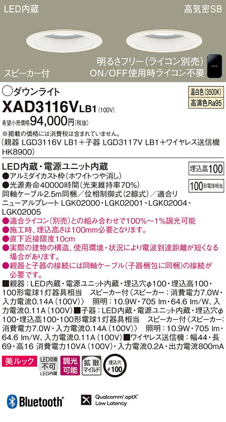 パナソニック Panasonic スピーカー付調光ダウンライト XAD3116LLB1 電球色 XAD3116VLB1 温白色 XAD3116NLB1 昼白色 ワイヤレス送信機・親子セット ホワイトつや消し 拡散マイルド Bluetooth接続 100形電球1灯器具相当