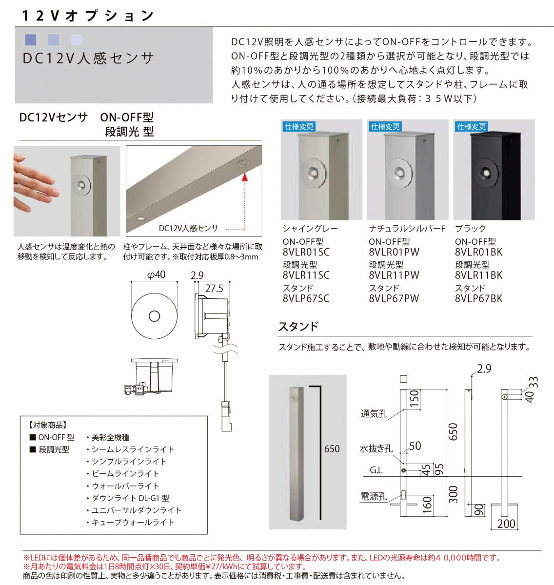 商 品 詳 細型番12V オプション DC12V人感センサ on/off型 シャイングレー[8VLR01SC]、ブラック[8VLR01BK]、ナチュラルシルバーF[8VLR01PW]仕様●DC12V照明を屋外でON・OFFすることができます。 暗くなると照明が30秒間自動点灯します。その後、スタンバイ中に人を感知すると「フル点灯」し、検知範囲に人がいなくなってから30秒間点灯した後に消灯します。(注:連続点灯への切替はできません)※点灯時間のタイマー調整機能はありません。●関連商品 ライン ペンダント ライト スポットタイプ LPS-L100 2カラー LED 8VLJ12■■102,560円ライン ペンダント ライト ラインタイプ LPL-L100 2カラー LED 8VLJ13■■72,850円ライン ペンダント ライト ラインタイプ LPL-L200 2カラー LED 8VLJ14■■94,020円ライン ペンダント ライト 12Vオプション 振れ止めセット 8VLJ15ZZ10,980円12V オプション DC12Vスイッチ 8VLP66■■15,050円 12V オプション スタンド H650 TE1100■■5,280円12V オプション DC12V人感センサ on/off型 8VLR01■■19,530円12V オプション DC12V人感センサ 段調光型 8VLR11■■21,571円