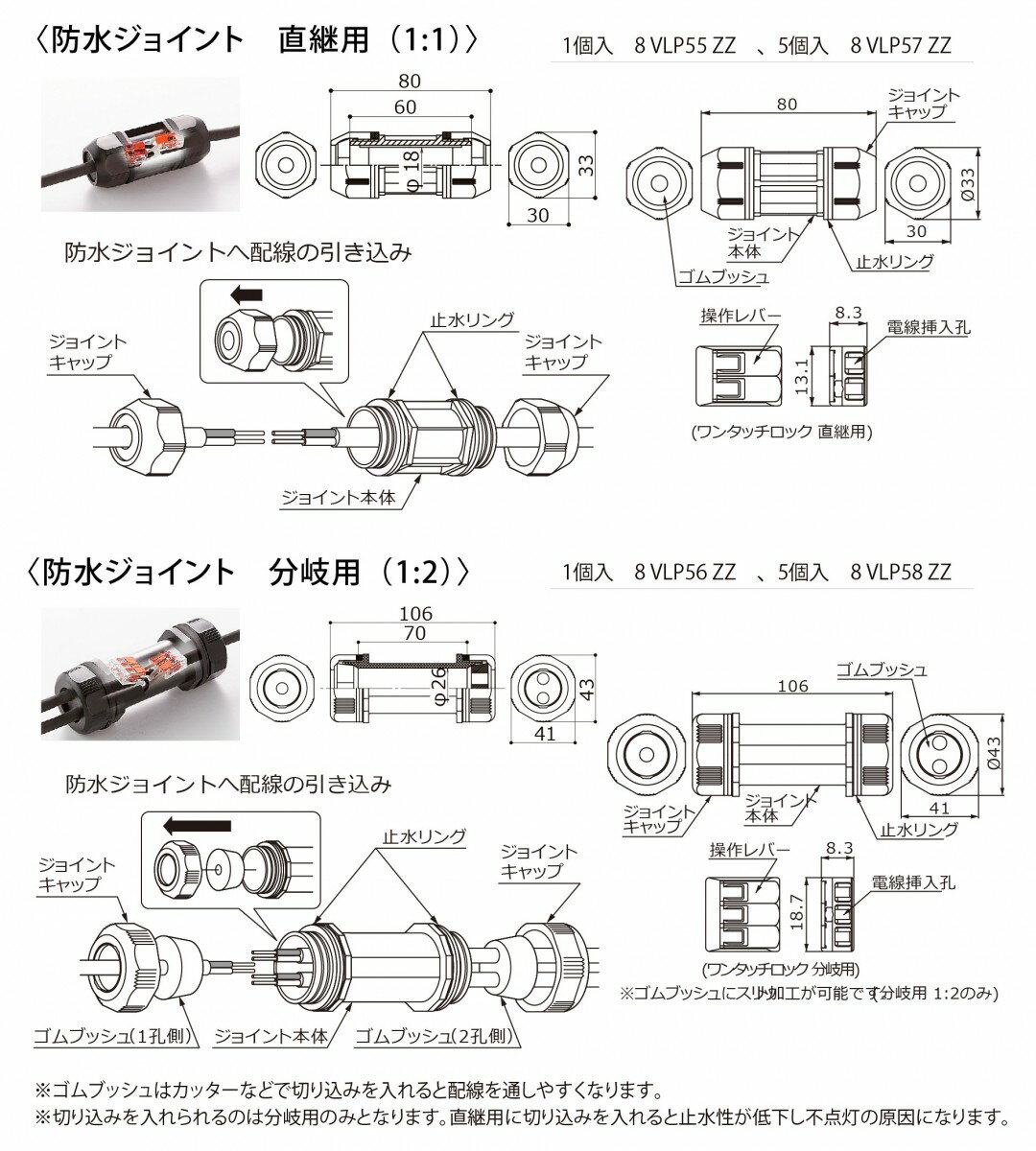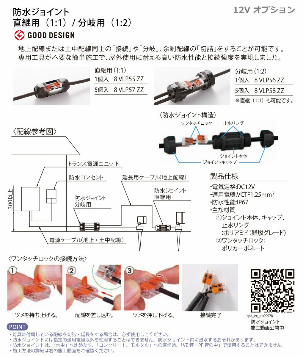 商 品 詳 細型番12V オプション 防水ジョイント分岐用(1:2) 1個 [8VLP56ZZ]仕様・電気定格:DC12V ・適用電線:VCTF1.25mm2 ・防水性能:IP67 ・主な材質 (1) ジョイント本体、キャップ、止水リング:ポリアミド(難燃グレード) (2) ワンタッチロック:ポリカーボネート商品説明地上配線または土中配線同士の「接続」や「分岐」、余剰配線の「切詰」をすることが可能です。専用工具が不要な簡単施工で、屋外使用に耐える高い防水性能と接続強度を実現しました。 ※防水ジョイントには指定の適用電線以外を使用することはできません。防水ジョイント内に浸水するおそれがあります。 ※防水ジョイントは、「水中」へ沈めたり、「コンクリート、モルタル」への直埋め、「VE管・PF管の中」で使用することはできません。●関連商品 12Vオプション 防水ジョイント直継用(1:1) 1個 8VLP55ZZ1,780円12Vオプション 防水ジョイント直継用(1:1) 5個 8VLP57ZZ8,130円12Vオプション 防水ジョイント分岐用(1:2) 1個 8VLP56ZZ1,780円12Vオプション 防水ジョイント分岐用(1:2) 5個 8VLP58ZZ8,130円