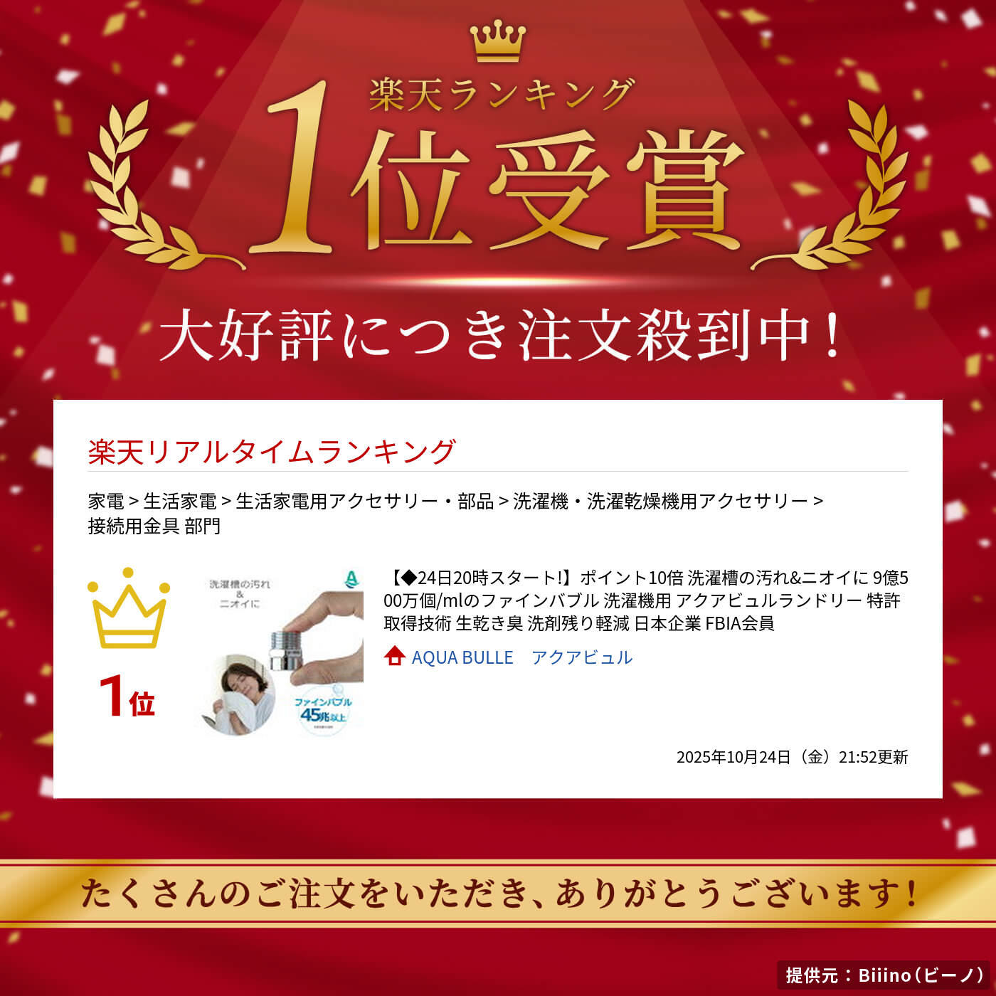 洗濯槽の汚れ&ニオイに 9億500万個/mlのファインバブル 洗濯機用 アクアビュルランドリー 特許取得技術 生乾き臭 洗剤残り軽減 日本企業 F