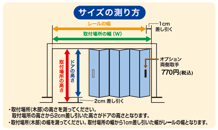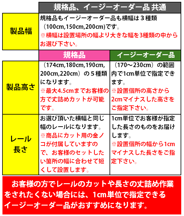 商品に付属のレールを天井部分にネジ止めして、そのレールにアコーディオンドアをセットして設置する商品です。 高さを1cm単位で変更できるイージーオーダー品と規格サイズ品(全15種類のサイズ)のご用意があります。 イージーオーダー品も規格品も横幅は3種類(100cm,150cm,200cm)です。 横幅は設置場所の幅より大きな幅を3種類の中からお選び下さい。 イージーオーダー品の高さは(170〜230cm)の範囲内で1cm単位で指定できます。商品の高さはレールも含んだ寸法です。 規格品の高さは5種類(174cm,180cm,190cm,200cm,220cm)になります。最大4.5cmまでお客様の方で丈詰めカットができます。 商品に付属のレールはイージーオーダー品は1cm単位でお客様が指定した長さのものをお届けします。規格品はお選び頂いた横幅と同じ幅のレールになります。横幅100cmの商品の場合、付属のレールも100cmのものが届きます。商品に金ノコが付属していますので、お客様のセットしたい箇所の幅に合わせて短くして設置します。 お客様の方でレールのカットや長さの丈詰め作業をされたくない場合には、イージーオーダー品がおすすめになります。 生地色は2種類(ファンデ、アクアライン)ありますが、イージーオーダー品はどちらも選べますが、規格品の方はファンデは全15サイズご用意がありますが、アクアラインは3サイズ(横幅100cm×高さ174cm、横幅150cm×高さ174cm、横幅200cm×高さ174cm)のみになります。 大型取手採用ですので、ドアを開閉時に握りやすく使いやすい大きさです。設置には、プラスドライバーが必要です。(規格品の全サイズ、イージーオーダー品の商品一覧)は《コチラ》になります。