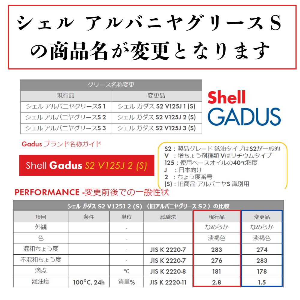 シェル アルバニヤグリースは、下記の通り銘柄が変更となっております。新: シェル ガダスS2V125J1(S)旧: シェル アルバニヤグリースS1新: シェル ガダスS2V125J2(S)旧: シェル アルバニヤグリースS2