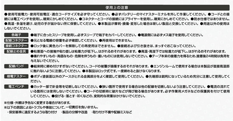 製品情報 製品コード 3363 ◆配線作業に必要なアイテムがそろった充実のセット ◆確実な圧着ができ、コード切断・被覆剥きなどができる多機能電工ペンチ、配線のチェックができる検電テスターをセット ◆細い線に対応できる配線コネクター・接続コネクターも入っている ◆小さな端子が取り出し易い底面R形状 ◆収納・整理に便利な透明ケース ◆ケースは予備ポケットもあり、フタに便利なスケール付き(20cm目盛り(目安)) 【使用可能電力/適合コードサイズ】 ▼ギボシ端子・平型端子(250型) クワ型端子(φ6)・丸型端子(φ8) ・DC12V車200W以下/DC24V車400W以下 ・AV(S)0.5~2sq ▼配線コネクター(白) ・DC12V車45W以下/DC24V車90W以下 ・AV(S)0.2~0.3sq ▼配線コネクター(赤) ・DC12V車110W以下/DC24V車220W以下 ・AV(S)0.5~0.85sq ▼配線コネクター(青) ・DC12V車200W以下/DC24V車400W以下 ・AV(S)1.25~2sq ▼接続コネクター ・DC12V車36W以下/DC24V車72W以下 ・AV(S)0.2~0.5sq 【内容物】 ・電工ペンチ×1 ・検電テスター×1 ・ギボシ端子セット×10 ・ギボシ端子セット(ダブル)×2 ・平型端子セット(250型)×5 ・クワ型端子セット(Φ6)×3 ・丸型端子セット(φ8)×3 ・配線コネクター(白)×2 ・配線コネクター(赤)×2 ・配線コネクター(青)×2 ・接続コネクター×2セット(4個) ・配線止めバンド(100mm)×10 ・配線止め金具ミニ(15.5×8mm)×10 ※画像はイメージです。実際の商品とは異なる場合がございます。 ※パッケージにつきましては、メーカーの仕様変更等により予告なく変更になる場合がございます。パッケージの違いによる返品・交換は承っておりませんので予めご了承ください。