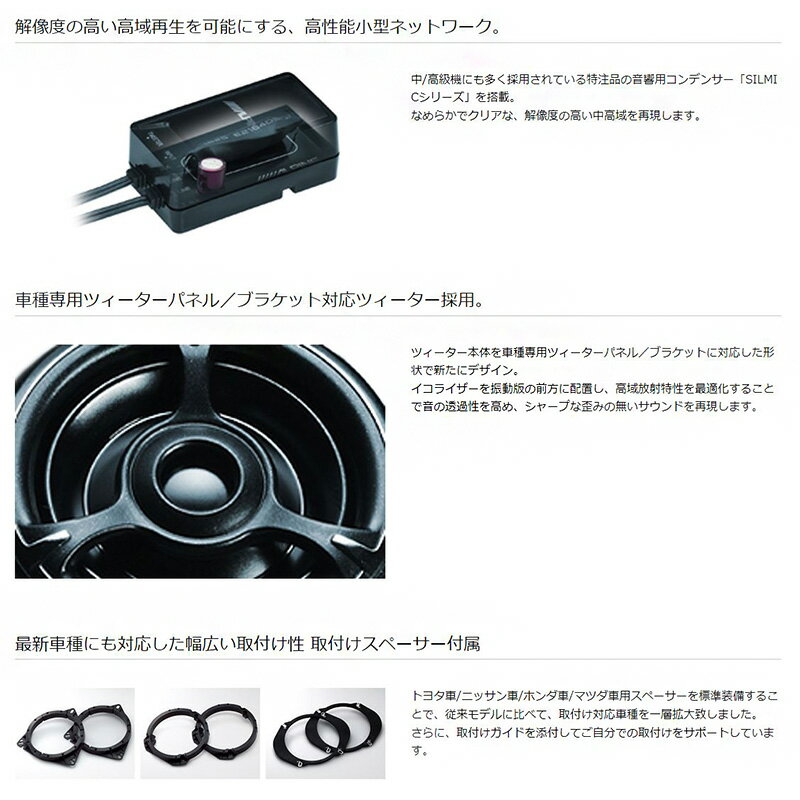 製品情報 スピーカー 製品番号 STE-G170S 瞬間最大入力 150W 定格入力 30W 再生周波数帯域 30Hz~48kHz 出力音圧レベル 92dB/W・m インピーダンス 4Ω デッドニング用防音/吸音材セット 防音シートサイズ 50mm×760mm 厚さ12mm 背面吸音材サイズ 150mm×150mm 厚さ20mm 適合情報 車種 型式 年式 トヨタハイエース 200系 H16/8~ ※適合情報については令和5年7月時点の情報となります。メーカーにて適合情報等が変更、更新される場合がございますので、必ずメーカーHPにて最新情報をご確認のうえお買い求めください。 ※画像はイメージです。実際の商品とは異なる場合がございます。 ※パッケージにつきましては、メーカーの仕様変更等により予告なく変更になる場合がございます。パッケージの違いによる返品・交換は承っておりませんので予めご了承ください。