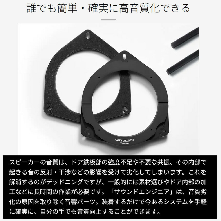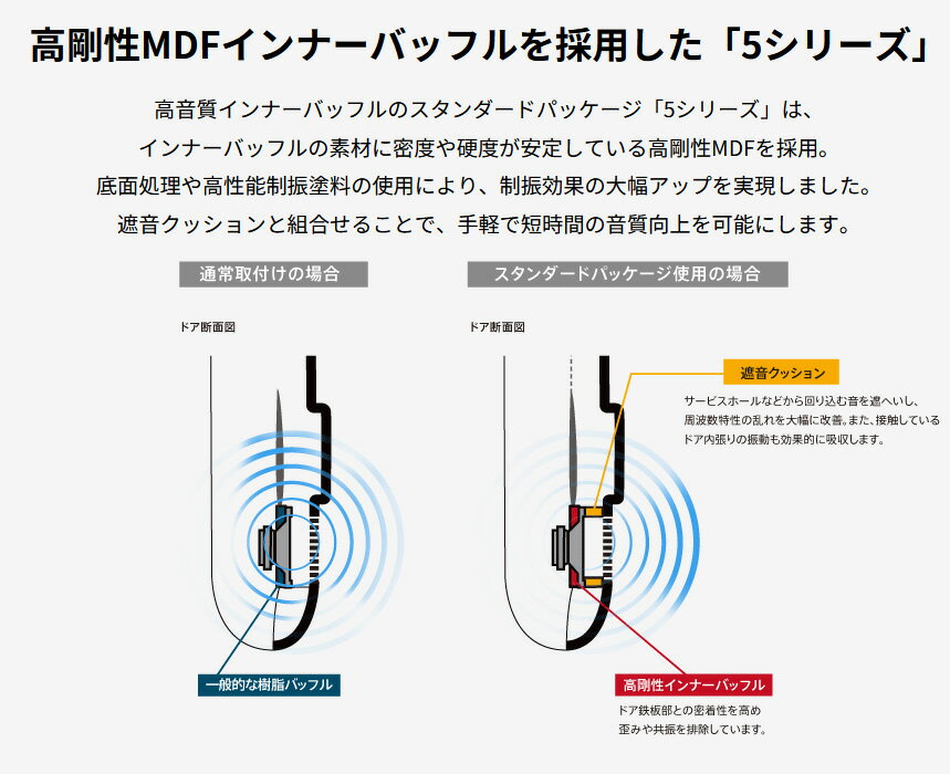 【付属品】インナーバッフル×2/取付ネジ(M5mm×25mm)×8/ナット(M5mm)×8/ワッシャー(M5mm用)×8/ワッシャー大(M5mm用)×8/バッフル用スペーサー×8/遮音クッション×2/遮音クッション用スペーサー×4 ※メーカー、型番、車種、年式などの適合がございます商品につきましては、お客様にて必ずメーカーHPをご確認ください。 ※画像はイメージです。実際の商品とは異なる場合がございます。 ※パッケージにつきましては、メーカーの仕様変更等により予告なく変更になる場合がございます。パッケージの違いによる返品・交換は承っておりませんので予めご了承ください。