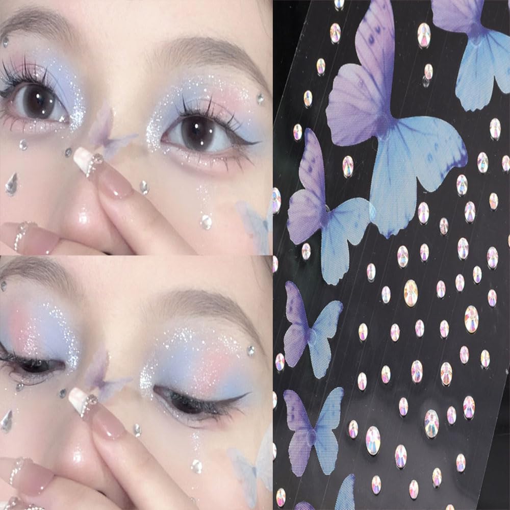 【送料無料】SensaBliss ラインストーン フェイスシール 顔 シール 4枚 キラキラ 3D ラインストーンステッカー ストーンシール 顔に貼るシール 涙メイク フェイスストーン ロースター ムーンストーンステッカー 蝶 ダイヤモンド デコパーツ キラキラ カラフル 自己吸着式で接