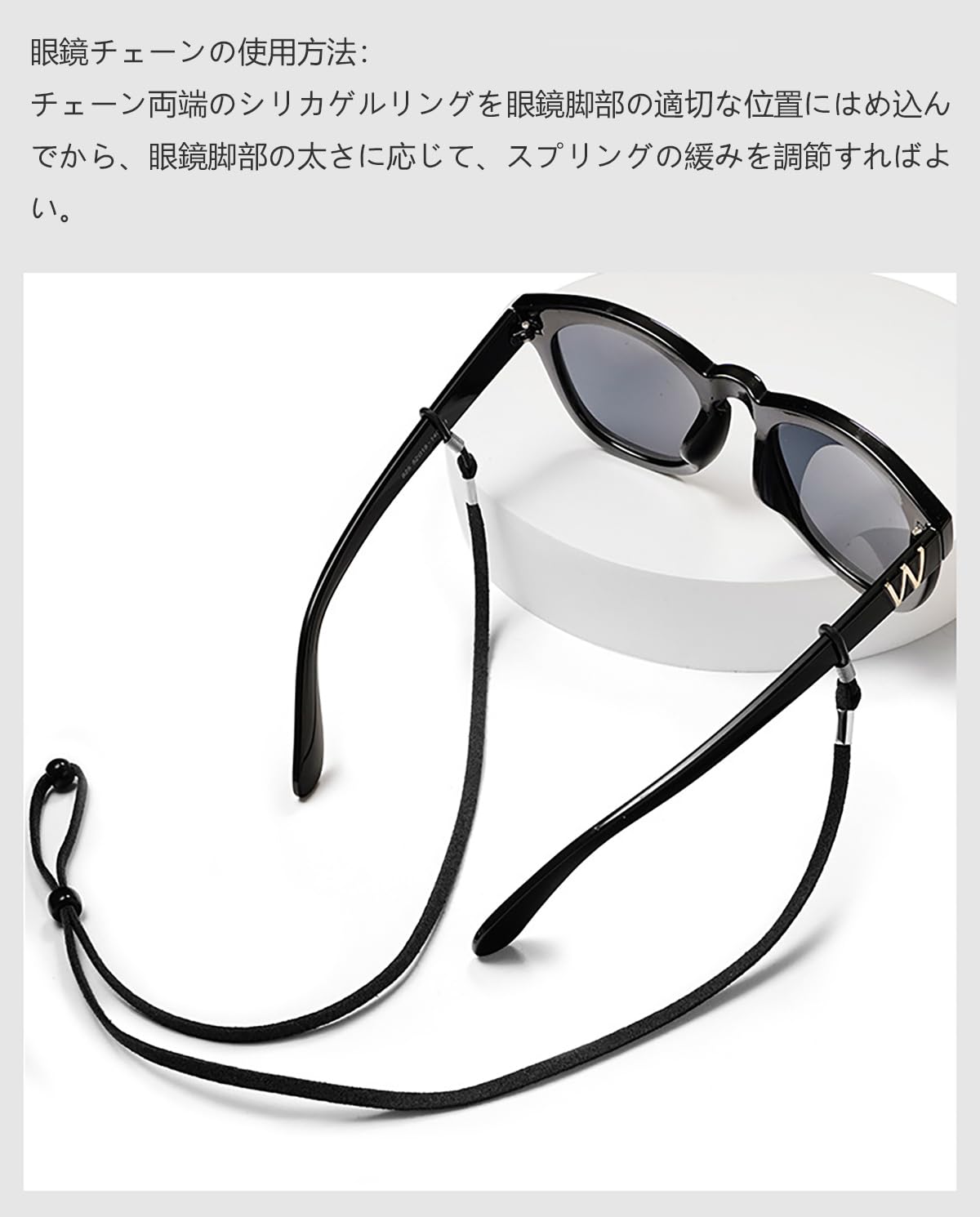 商品情報商品の説明説明 【眼鏡の落下・紛失を防ぐメガネチェーン】このメガネチェーンはサングラスや眼鏡をしっかりと固定し、落下や紛失、破損を防ぎます。メガネや老眼鏡の着脱が頻繁な方にとって、非常に便利なアクセサリーです。カバンへの出し入れが面倒な方に特におすすめで、軽量かつズレ落ちを防止するデザインは、男女問わずおしゃれなアクセサリーとしてお使いいただけます。運動や仕事中の眼鏡の落下や損傷から守り、快適かつ安全に使用できるため、作業効率の向上にも貢献します。 【耐錆性】湿気の多い環境、例えば海や汗をかく状況を考慮し、金属金具には錆びにくいステンレス素材が使用されています、快適な装着感を提供します。 【無段階長さ調節】ストラップにはストッパーが付いており、長さを無段階で調節できるため、自分に最適なフィット感を実現できます。 【ストラップの特徴】紐部分は100%スエード素材で、起毛感がありながらも薄手で耐久性に優れ、肌触りが柔らかく快適です。シンプルなブラックカラーはどんなワークスタイルにもフィットし、ガーデニング、オフィス、屋外作業、スポーツ、アウトドア、レジャーなど多様なシーンで使用できます。また、そのシンプルなデザインはどんなファッションにも合わせやすく、気分に合わせた手軽なイメージチェンジを楽しむことができます。 【簡単取り付け・超軽量・適切な長さ】メガネのテンプルにグラスコードの輪を通すだけで、取り付けは2つの簡単なステップで完了します。1.メガネのテンプルをグラスコードの先端の輪に通します。2.金具で締め、位置を調整して装着を完了させます。主な仕様 【眼鏡の落下・紛失を防ぐメガネチェーン】このメガネチェーンはサングラスや眼鏡をしっかりと固定し、落下や紛失、破損を防ぎます。メガネや老眼鏡の着脱が頻繁な方にとって、非常に便利なアクセサリーです。カバンへの出し入れが面倒な方に特におすすめで、軽量かつズレ落ちを防止するデザインは、男女問わずおしゃれなアクセサリーとしてお使いいただけます。運動や仕事中の眼鏡の落下や損傷から守り、快適かつ安全に使用できるため、作業効率の向上にも貢献します。【耐錆性】湿気の多い環境、例えば海や汗をかく状況を考慮し、金属金具には錆びにくいステンレス素材が使用されています、快適な装着感を提供します。【無段階長さ調節】ストラップにはストッパーが付いており、長さを無段階で調節できるため、自分に最適なフィット感を実現できます。【ストラップの特徴】紐部分は100%スエード素材で、起毛感がありながらも薄手で耐久性に優れ、肌触りが柔らかく快適です。シンプルなブラックカラーはどんなワークスタイルにもフィットし、ガーデニング、オフィス、屋外作業、スポーツ、アウトドア、レジャーなど多様なシーンで使用できます。また、そのシンプルなデザインはどんなファッションにも合わせやすく、気分に合わせた手軽なイメージチェンジを楽しむことができます。【簡単取り付け・超軽量・適切な長さ】メガネのテンプルにグラスコードの輪を通すだけで、取り付けは2つの簡単なステップで完了します。1.メガネのテンプルをグラスコードの先端の輪に通します。2.金具で締め、位置を調整して装着を完了させます。