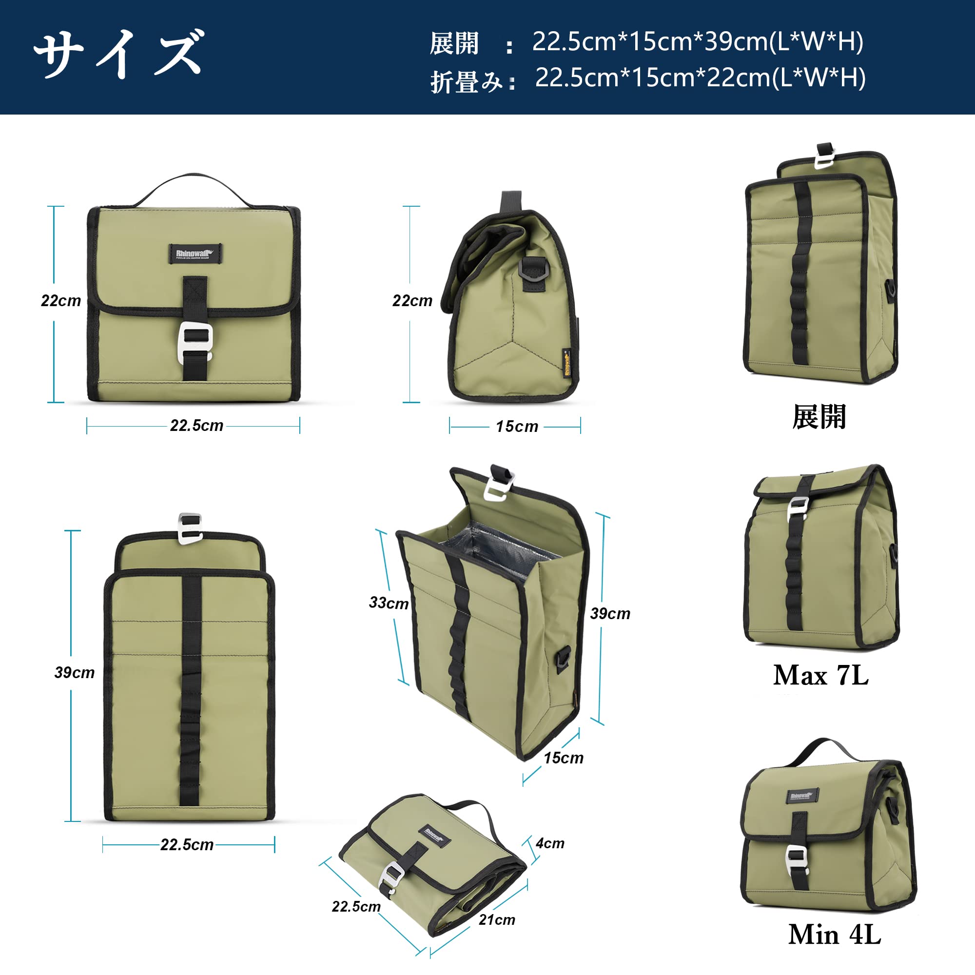商品情報商品の説明ブランド:Rhinowalk 自転車フロントバッグ 材質:ターポリン 重量:約450g カラー:ブラック/グリーン 容量:6レベル調整可能、最大7L サイズ:22.5*15*22cm※詳細は商品画像内をご参照ください 包装内容:バッグ*1、ショルダーストラップ*1、レインカバー*1 ★★弊社では厳しい品質管理をしております。万が一不良品が届いた、または付属品の欠品がある場合、お気軽にご連絡下さい。主な仕様 【大容量&保温保冷】6レベルの調整可能な容量、最大7L容量。 広い収納スペースには、ビール、飲み物、弁当、iPad、エアポンプ、財布などを簡単に収納できます。バッグの裏地は厚さ5mmEPEと断熱アルミニウムフィルムで、保温保冷の効果がある。お弁当袋として利用できます。br【適用自転車】ブロンプトン(Brompton)などに代表される、フロントキャリアブロックの搭載が可能な折り畳み自転車へおすすめのフロントバッグです。(※フロントキャリアブロックはパッケージに含まれていません)br【多機能バッグ】取り外し可能なショルダーストラップ付き、自転車フロントバーバッグ、ショルダーバッグ、ハンドルバッグとしても使える多機能バッグです。br【取付簡単、使用便利】ブロンプトンフロントキャリアブロックに取り付けるように設計されているビルトインメタルアダプター、使いやすいです。メタルバックルと適当な開き幅で、アイテムを見やすく取り出しやすいです。br【商品仕様】サイズ22.5*15*22cm;重量450g;6レベルの調整可能な容量、保冷保温;表面に撥水効果のターポリン素材を使用しており、防水レインカバー付き、雨の日にも使えます(完全防水仕樣ではありませんので、長時間雨を浸さないでください)。