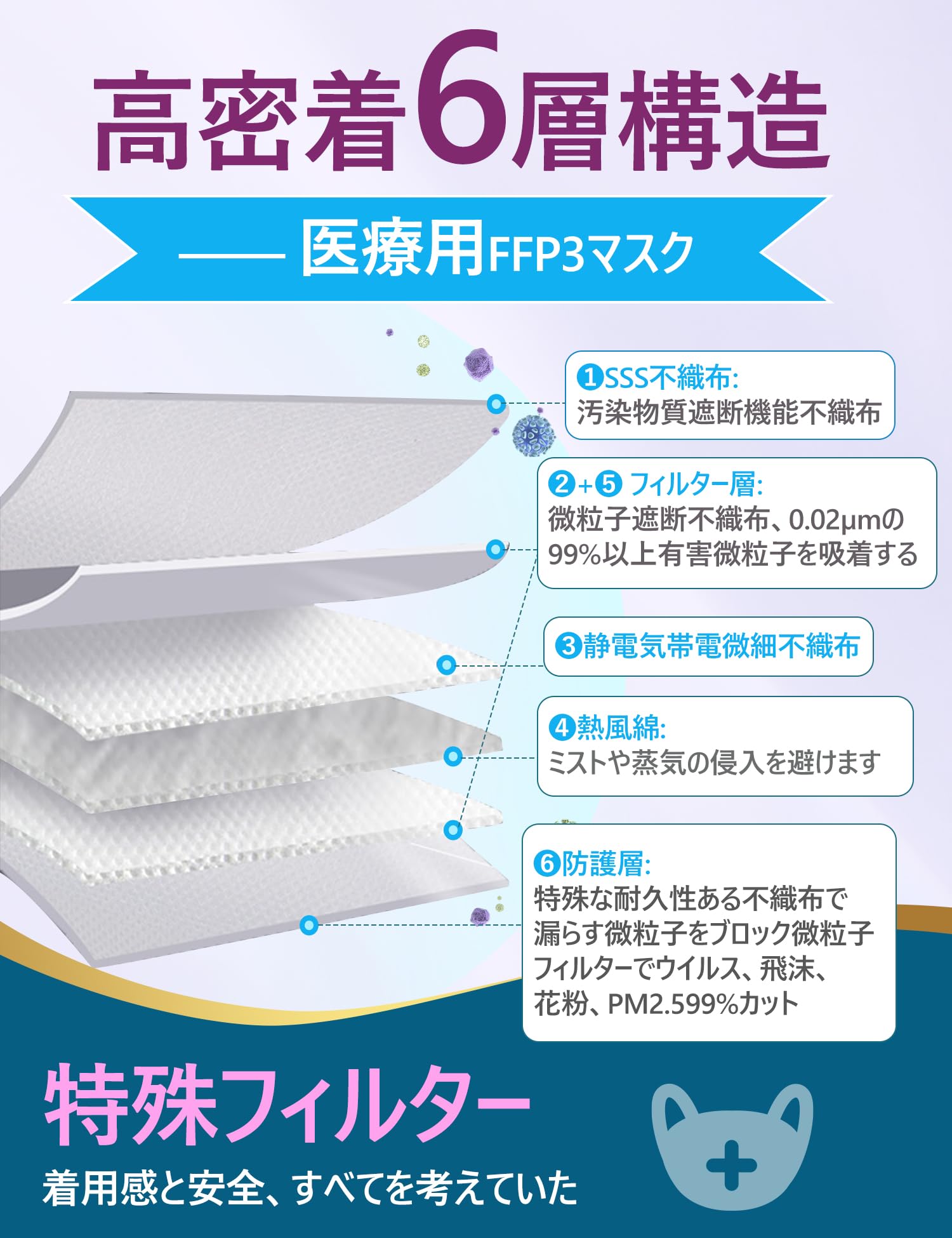 商品情報商品の説明主な仕様 【基本商品情報】可のFFP3マスクで、 EU規格最高防護レベル。不織布6層フィルター マスク、ホワイト25枚セット(1点フック付き、耳に負担が少ない)、個別包装で持ち運びやすい。だいばいりょうちゅうもんにたいおうしています【6層構造の高機能マスク】EU規格をクリア、より高規格な微粒子用6層構造マスクです。0.075土 0.02μm の微粒子を99%以上除去。6層構造不織布で、ウイルス、飛沫、花粉、PM2.5などをしっかりブロックして健康を守ります。病院等のハイリスク場所や航空機、車内等の狭い空間での長時間滞在時、通勤、通学、ガーデニング、車の運転など様々なシーンで活躍。【フック付き・耳が痛くならない・肌に優しい】不織布素材は極細の柔らかい繊維で構成されており、お肌に優しいです。各商品箱には一点のフック付き、耳紐の長さが3段階で調整でき、耳が痛くない、実用的かつ衛生的です。【3D立体構造】ノーズワイヤーが鼻の形にぴったりフィット内側のノーズスポンジで鼻へのあたりがやさしく密着性もアップ、快適な呼吸スペースが確保できる3D立体デザインを採用しています。ノーズワイヤーが付いているので密着性もアップし、メガネも曇りません。通気性が強い、高機能性、立体でお化粧がつきにくい。【衛生的な個別包装】また衛生的な個包装使い捨てタイプ。携帯に便利な折りたたみ式。お出かけの際には予備としても持ち運びしやすいです。病院、介護施設はもちろんのこと、美容ケア、エステ、映画館、劇場、コンサートホール、会議、人との距離を保てない閉鎖空間においてFFP3マスクでリスク軽減。