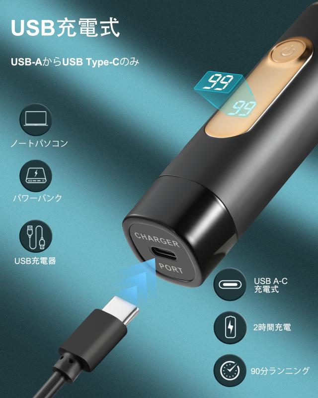 男性用鼻毛カッター、2イン1充電式ノーズトリマー LEDディスプレイ付き 男性用 痛みのない USB 充電式眉毛&顔用ヘアトリマー、デュアルエッジブレード、ブラックゴールドこのワイヤレストリマーは、鼻毛、耳の毛、眉毛、ひげ、浮遊した顔の毛など、顔のグルーミングのニーズをすべて処理します。 交換可能なヘッドが2つ付属しているので、衛生を保ちながら家族と共有できます。 デュアルヘッドデザインにより、どこでも手入れをしたいカップルや旅行仲間に最適です。強力な13,000RPM銅コアモーターは、滑らかで痛みのないトリミングを実現します。 360°回転するステンレススチールブレードは、引っ張ったり刺激を与えたりすることなく、顔の輪郭に沿います。 低刺激性のブレードは、鼻と耳に快適にフィットするように特別に設計されており、毎回安全で正確なトリミングが可能です。USB-C経由でわずか2時間ですばやく充電 - もうバッテリーを買う必要はありません 大容量バッテリーは数週間持続します。 当社のスマート充電システムは、過充電や短絡を防ぎます。 外出先で信頼できるグルーミングが必要な旅行者に最適です。LEDディスプレイはバッテリー残量をはっきりと表示するので、トリムの途中で電力が不足することはありません。 高度なノイズリダクションにより、電動歯ブラシよりも静かに操作できます - 早朝や深夜に他の人の邪魔をする心配はもうありません。LEDディスプレイはバッテリー残量をはっきりと表示するので、トリムの途中で電力が不足することはありません。 洗練されたペンスタイルのデザインは、ポケット、トイレタリーバッグ、スーツケースに簡単に収まります。 耐久性のあるABSプラスチック製で、旅行時の摩耗や損傷に耐えながら軽量です。 付属のダストカバーで使う間も清潔に保てます。IPX7防水等級は、使用後にブレードを水ですすぐことができることを意味します。 取り外し可能なヘッドにより、掃除が素早く衛生的です。 ●使用間の清潔さを保つ保護ダストカバー付き。素晴らしい贈り物になります あらゆる電源から充電できるUSBケーブル付き。 男女兼用です。 エレガントなパッケージは、誕生日、父の日、または理由だけで贈り物にすぐに使用できます。