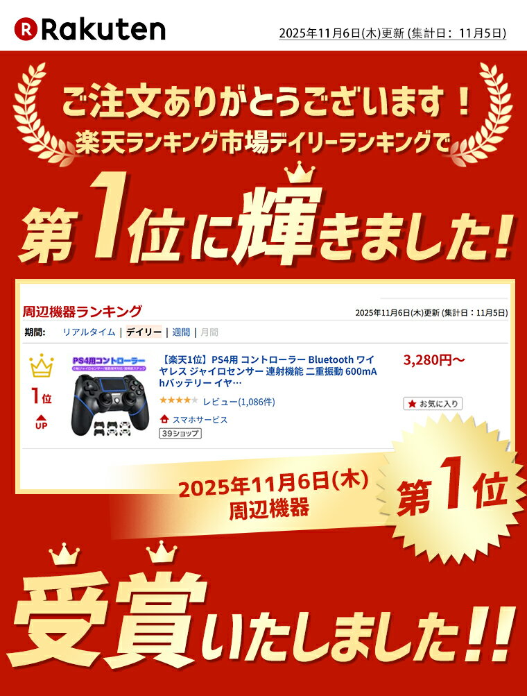 メーカー希望小売価格はメーカーカタログに基づいて掲載しています※画像はイメージであり、商品の仕様は予告なく変更される場合がありますので予めご了承ください。 -商品ポイント- 【対応機種】 本PS4用コントローラーはPS4専用のコントローラーです。PS4だけではなく、PS4 Proにも対応できます。USB端子に接続するだけで、有線コントローラーになれ手軽に使い始められます。 最新PS4システムを対応します。ご注意:FPS、TPSとのゲームにはあまり向いていません。予めご了承ください。コントローラー背面にはリセットキーがあり押すと、PS4にペアリングや充電できない、ボタンの反応が悪い、スティックが勝手に動くなどの問題が解決します。 【アップデートした機能】 PS4用コントローラーには最新Bluetoothチップを搭載され、PS4との最大到達距離は約10m,最大伝送速度が2.1Mbpsを達しました。また、ジャイロセンサー、600MAHリチウム電池、長い稼働時間、タッチパッド、二重振動、人間工学に基づくなどの特徴を備えています。高感度のタッチコントロールパネルと共有ボタンがあり、複数人数で様々な使い方ができます。独自のデュアルショック機能が搭載され、タイムリーに振動がプレイヤーへ伝わり迫力あるプレイが可能に。本格的なゲームが楽しますよ。注:ヘッドフォン(CTIA規格)をデバイス(OMTP規格)に接続すると、音量と音質に影響しますが、通常の使用には影響しません。 【人間工学設計】 本PS4用コントローラーは人間工学の考えに基づいて設計され、握り部分には凹凸面を設計し、手汗によるスリップを予防でき、握ると手に馴染んでしっかり掴めます。大すぎずシンプルな形状なので、手の小さい方や女性などでも楽に使えます。約250gの軽量設計で負担がかかりにくい長時間ゲームを遊んでも疲れません。スティック中心部の窪みが深く、微細なスティック操作の際に、指になじむので操作感アップにして抜群の使用感を与えます。 【高耐久性ボタンや高感度スティック】 本製品は360°可動するジョイスティックを搭載したPS4用ゲームパッドです。耐磨耗技術を採用され、スムーズに遅延なく、耐用性アップにします。操作性を追求し、繊細な操作を必要とするアクションゲームやシューティングゲームでもストレスなくプレイできます。また、誤入力の少ない十字型キーを採用しており、軽い力で操作できるようになり、スムーズに動き、より反応の良い、感触の良いフィーリングを実現します。コントローラーは高品質ゴムを採用され、300万回の耐久テストをクリアしています。*ご注意:本コントローラーは純コンと比べてボタンの耐久性を高めるため、少し硬いを作ります。スティックの精度が純コンより下げ、FPS、TPS等のゲームをプレイする時に少し視点が動く可能性がありますので、アクションゲームにススメで、FPS、TPS等のゲームにはあまり向いていません。不良ではありません。ご購入前に予めご了承ください。 【600mAhの大容量バッテリー】 2021年最新アップグレードされたPS4用コントローラーには、600mAhの大容量充電式バッテリーが搭載されており、一回フル充電すると10時間使い続けます。日常の使用では、フル充電してから約1週間使用できます。内蔵の最先端ワイヤレスチップを採用され、通信の遅延や切断の問題は発生せず、ゲーム世界に完全に没頭させます。